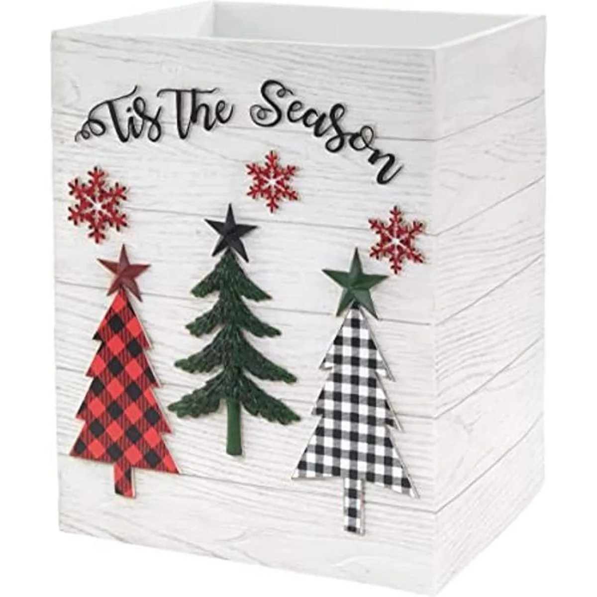 Clásico de Navidad: el cubo de basura decorativo Tis the Season cuenta con pinos artísticamente representados en un patrón de cuadros de búfalo en los tradicionales colores rojos y verdes de Navidad. Los árboles están sobre un fondo de madera envejecida, rodeados de copos de nieve rojos y Tis The Season en escritura estilizada negra.
