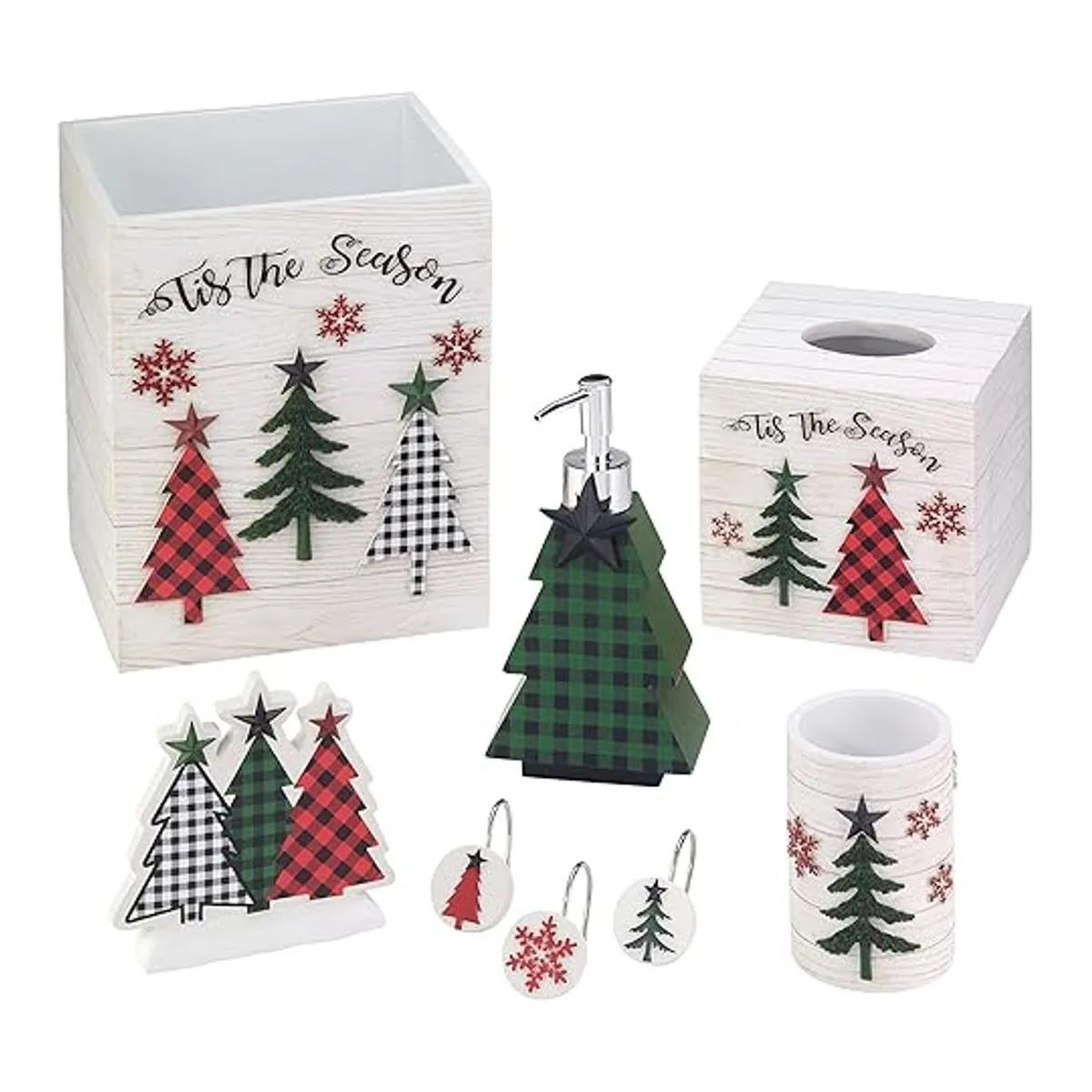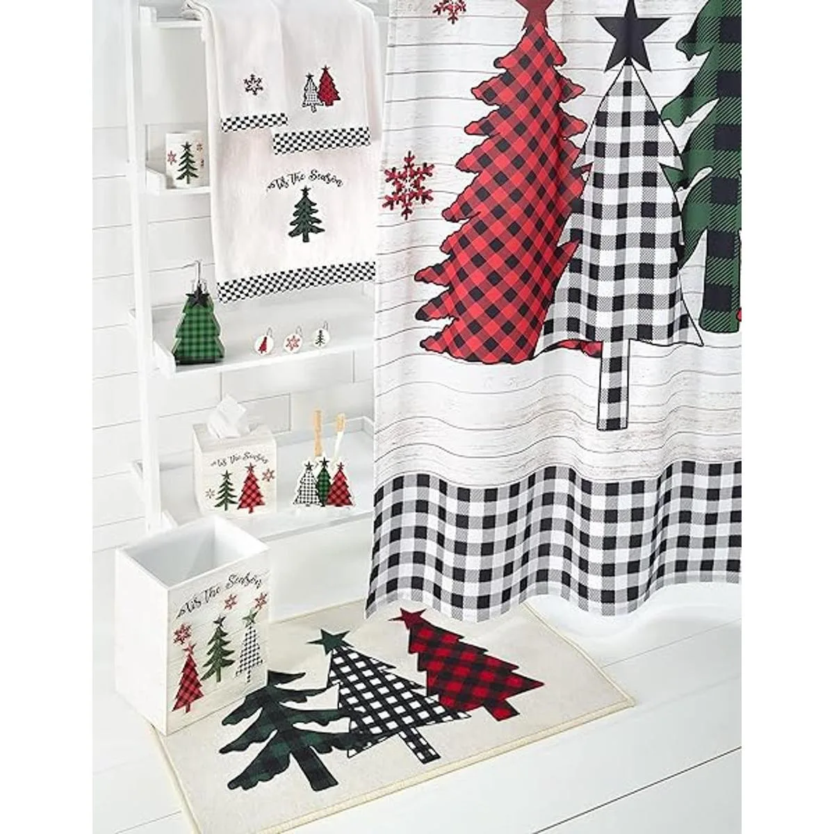 Inspirado en la granja: la colección Tis the Season de accesorios de baño coordinados de Avanti cuenta con pinos verdes cazadores, blancos y rojos con un patrón de cuadros de búfalo, copos de nieve artísticamente representados, madera envejecida y, por supuesto, ese recordatorio clásico Tis the Season en escritura estilizada.