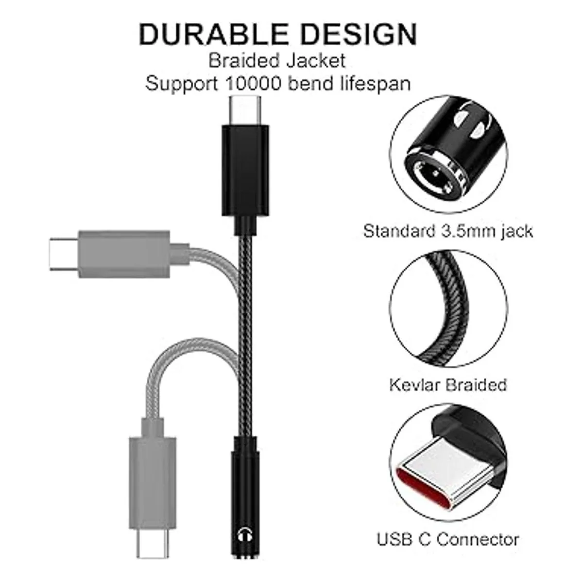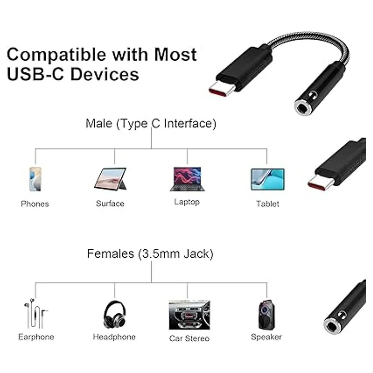 Adaptador USB C a auxiliar: compatible con smartphone USB C sin conector de audio de auriculares de 0.138 in. Con este dongle USB C, puedes seguir utilizando tus auriculares de 0.138 in para escuchar música, contestar llamadas telefónicas y función de control de volumen con cable. Combina perfectamente con tus auriculares, altavoces y estéreo de coche