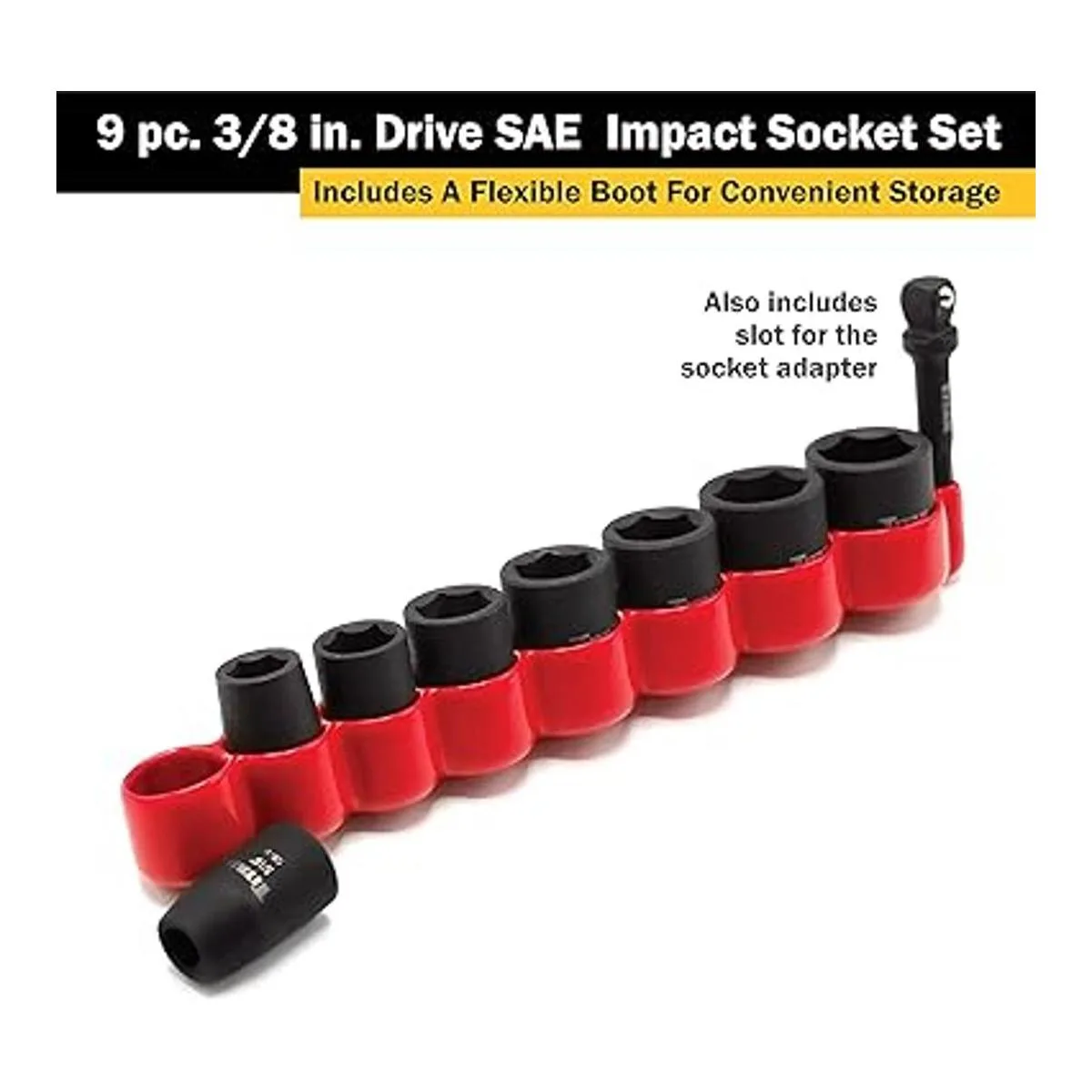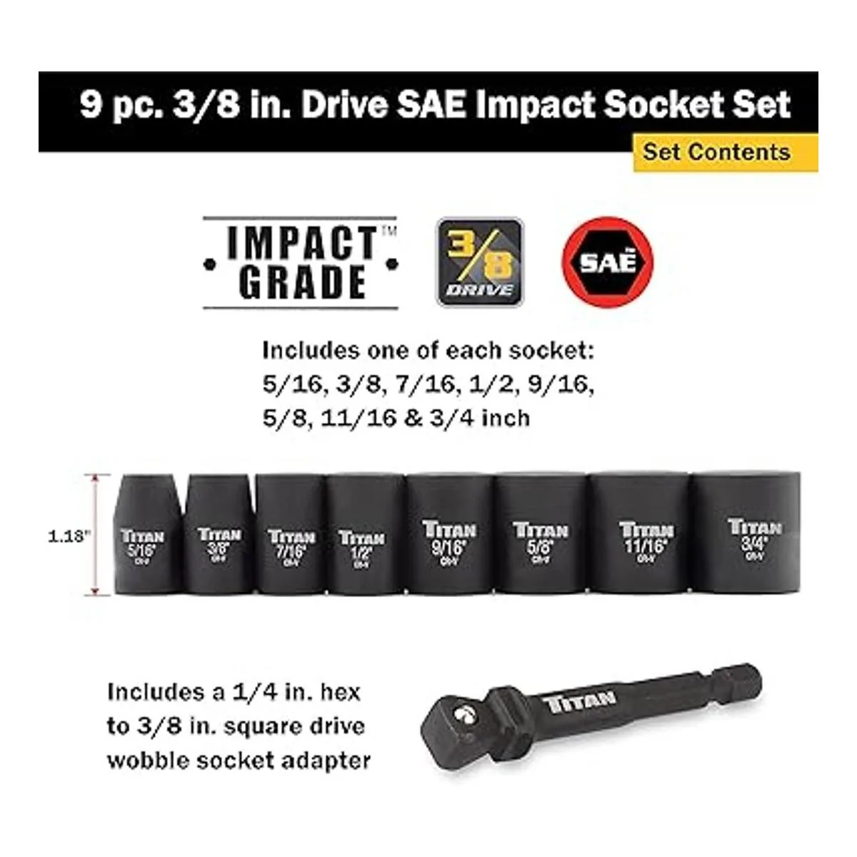 El juego incluye: 5/16, 3/8, 7/16, 1/2, 9/16, 5/8, 11/16, 3/4 pulgadas de impacto y 1 adaptador hexagonal de 1/4 pulgadas a 3/8 pulgadas