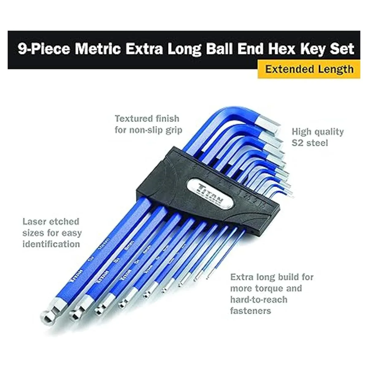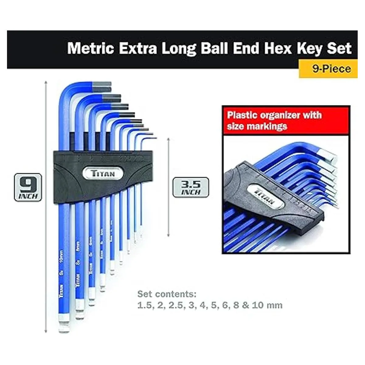 Titan Tools 12714, juego de llaves con punta hexagonal y redonda, con brazo extralargo, métrica, 9 unidades