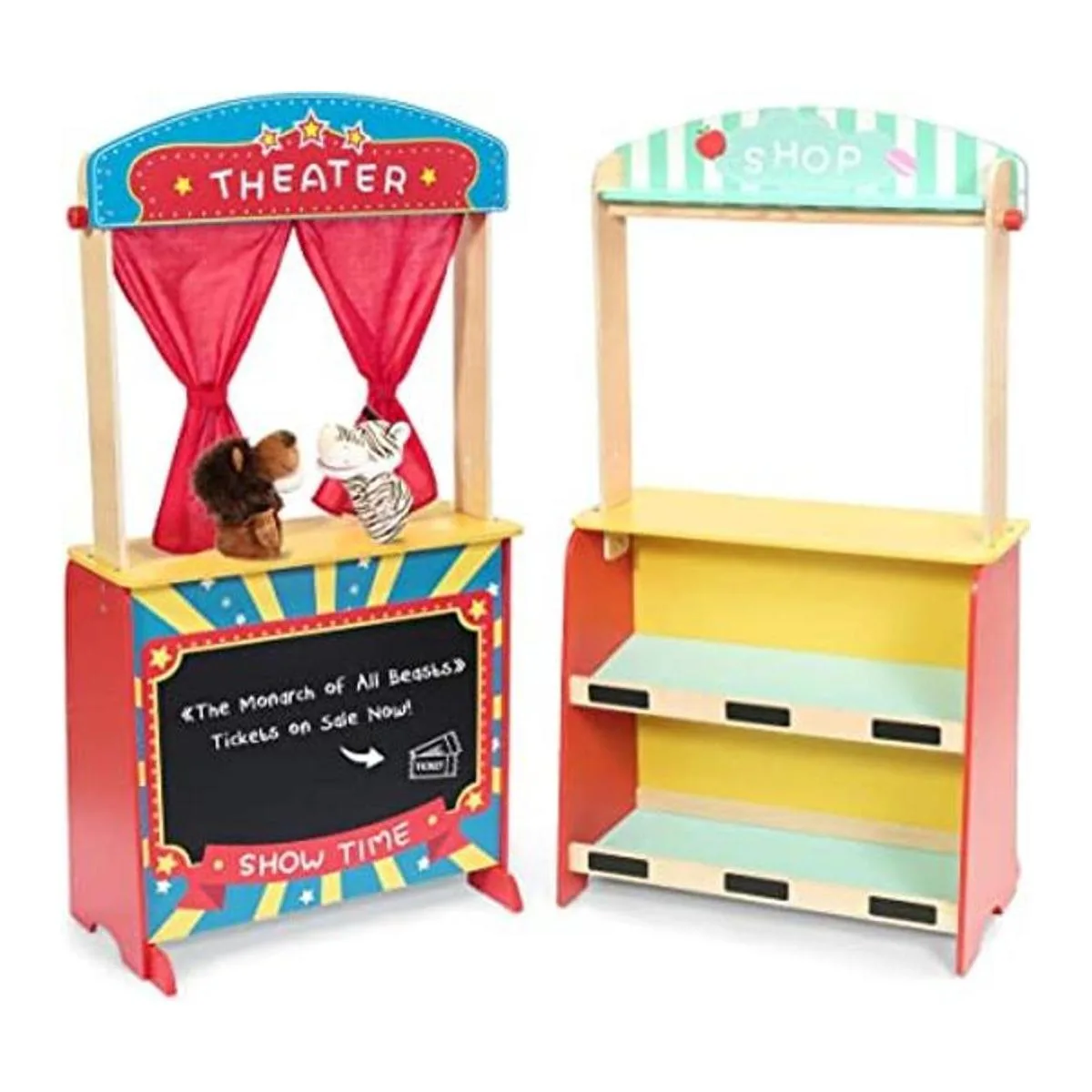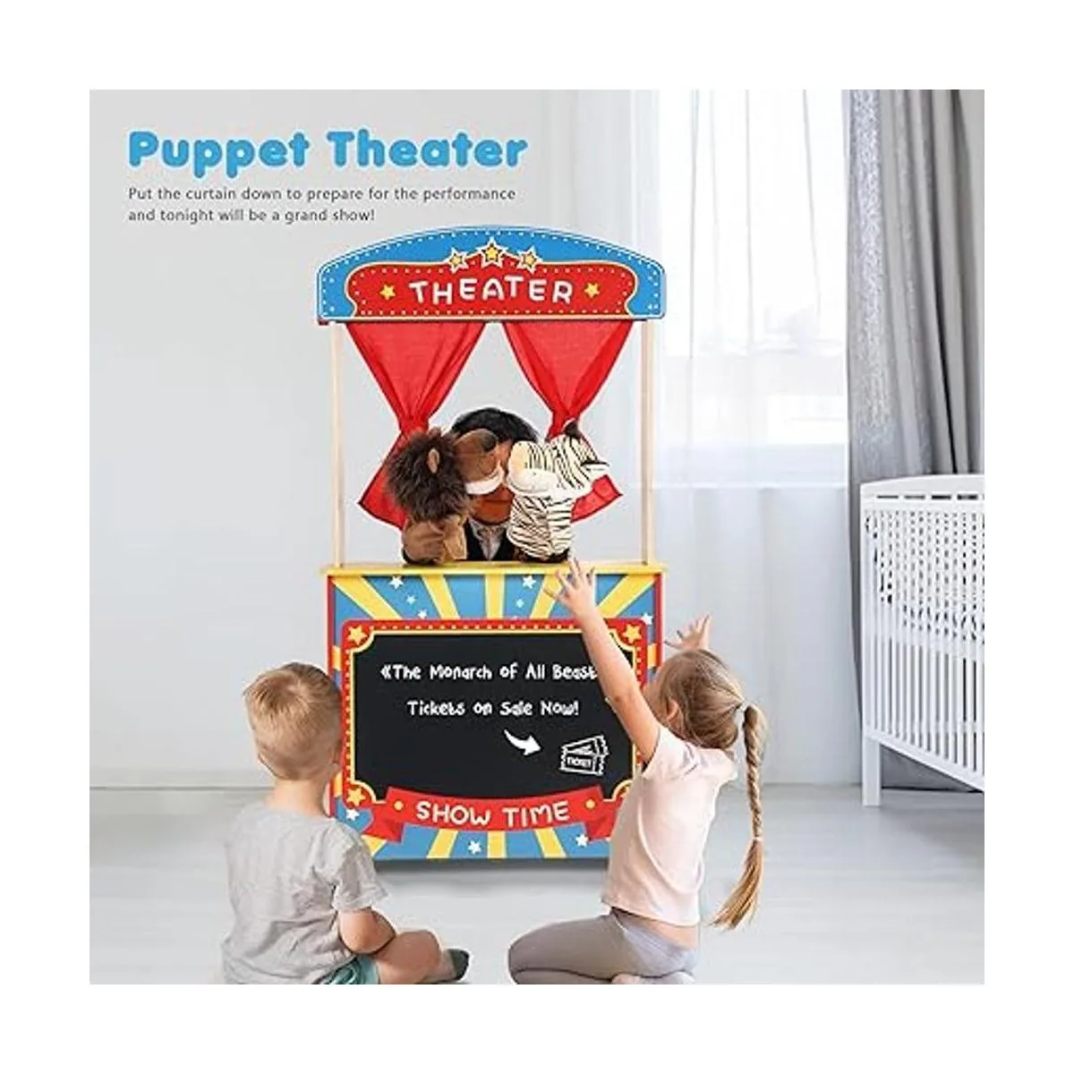 Títeres de madera para teatro de marionetas de 2 manos, soporte de limonada de doble cara Rundad y espectáculo de marionetas para niños, juguete de teatro de marionetas de lujo de madera con pizarra