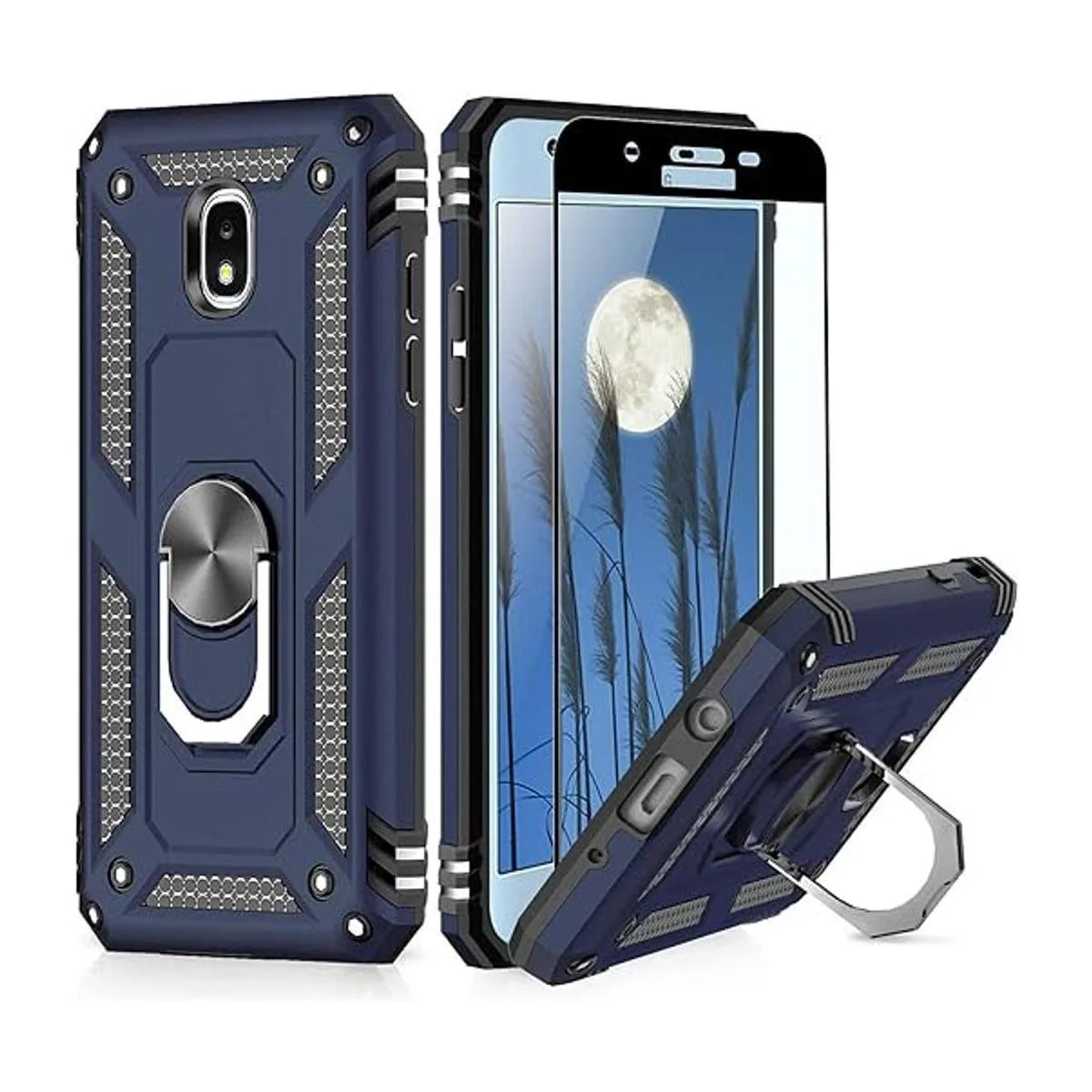 TJS Funda para teléfono compatible con Samsung Galaxy J7 2018J7 RefineJ7 StarJ7 EonJ7 TOPJ7 AeroJ7 CrownJ7 Aura, Protector de pantalla de vidrio templado de cobertura completa Soporte magnético de anillo de metal azul
