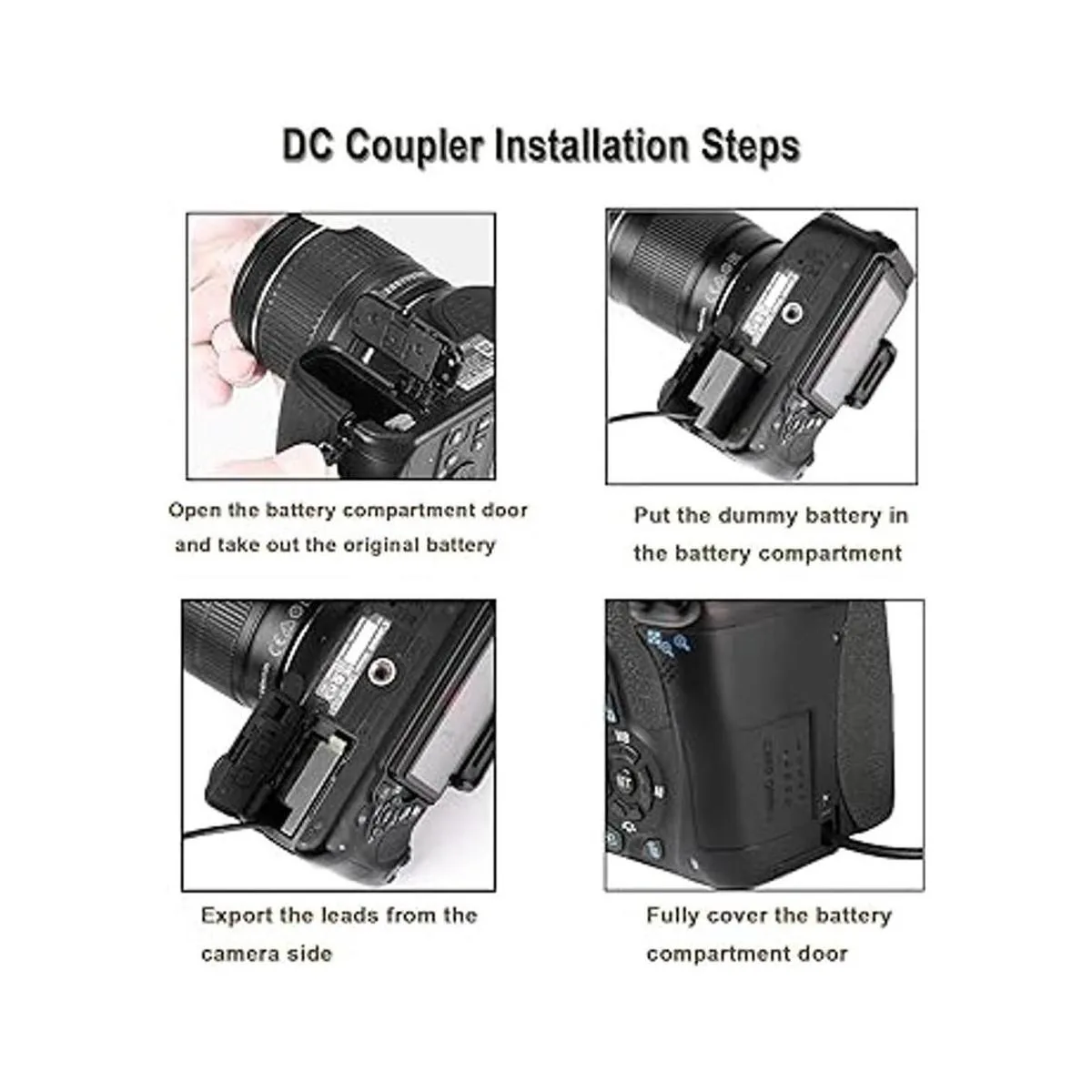 Principio de trabajo: el acoplador de conector CC DRE8 reemplaza la batería LPE8, equipado con adaptador de corriente de CA a CC, carga continua para tu cámara.