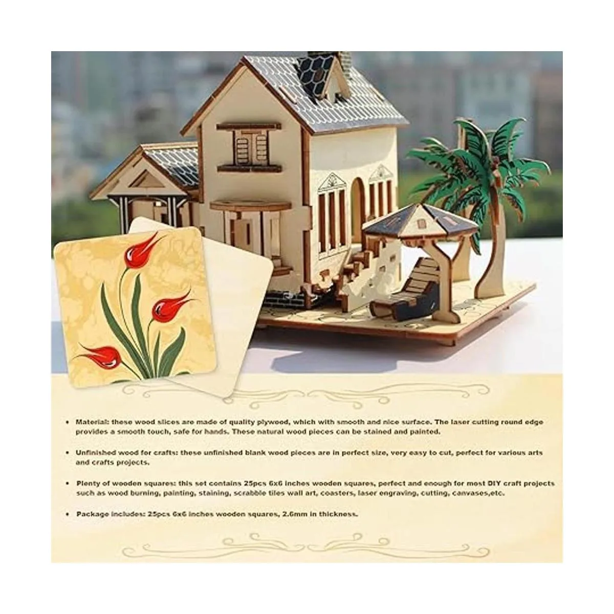 El paquete incluye: 25 cuadrados de madera de 5.9 x 5.9 in para manualidades, 0.102 in de grosor.