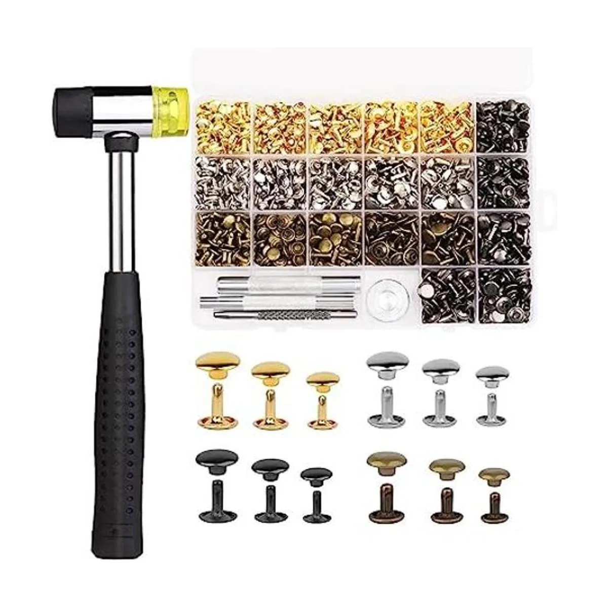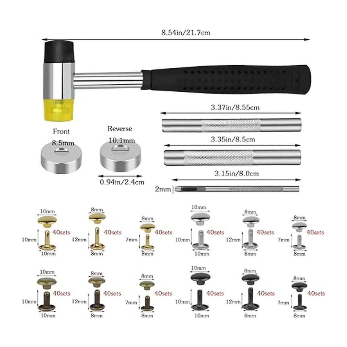 GREAT VALUE SET: 480 Sets double cap rivets with 120Gold 40 each for 3 sizes, 120Silver 40 each for 3 sizes, 120Brown 40 each for 3 sizes, 120Black 40 each for 3 sizes; 1 Double head rubber hammer, 1 Antislip punch, 2 Rivet bars, 1 Rivet base, various options for you to choose from.