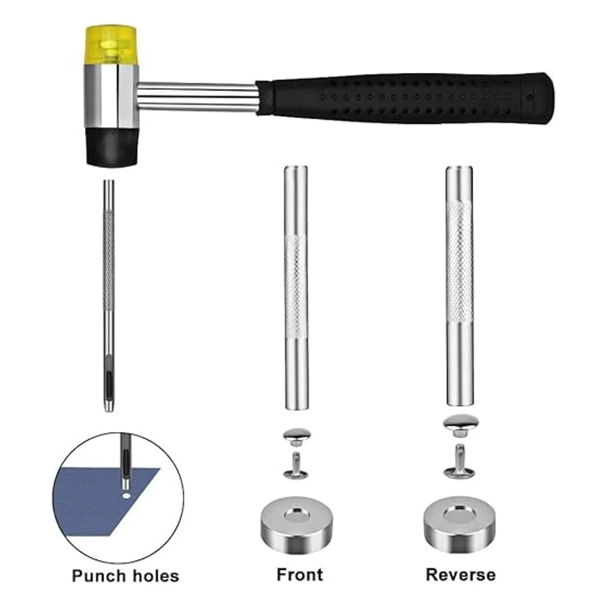Complete Setting Tools: The leather rivet kit includes 5 setting tools for fixing and punching leather. One of the rubber hammer is doubleheaded and has a rubber handle, which is comfortable to handle and reduces shock.