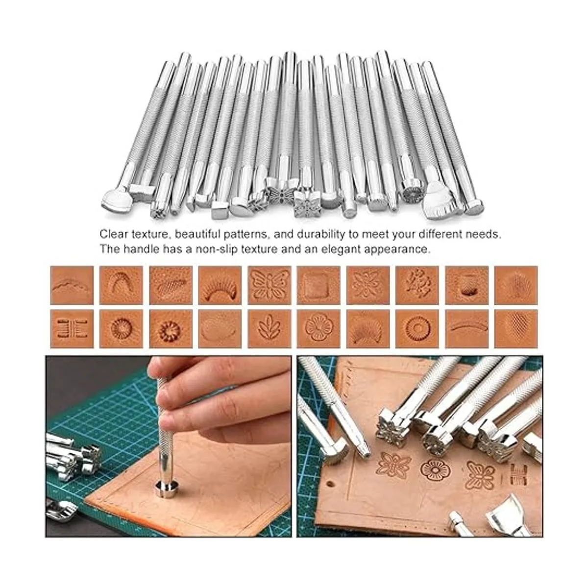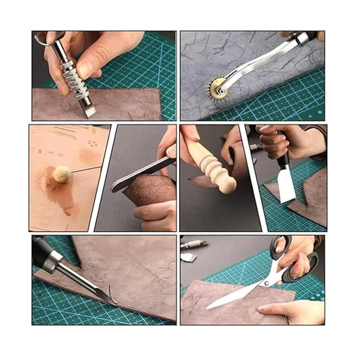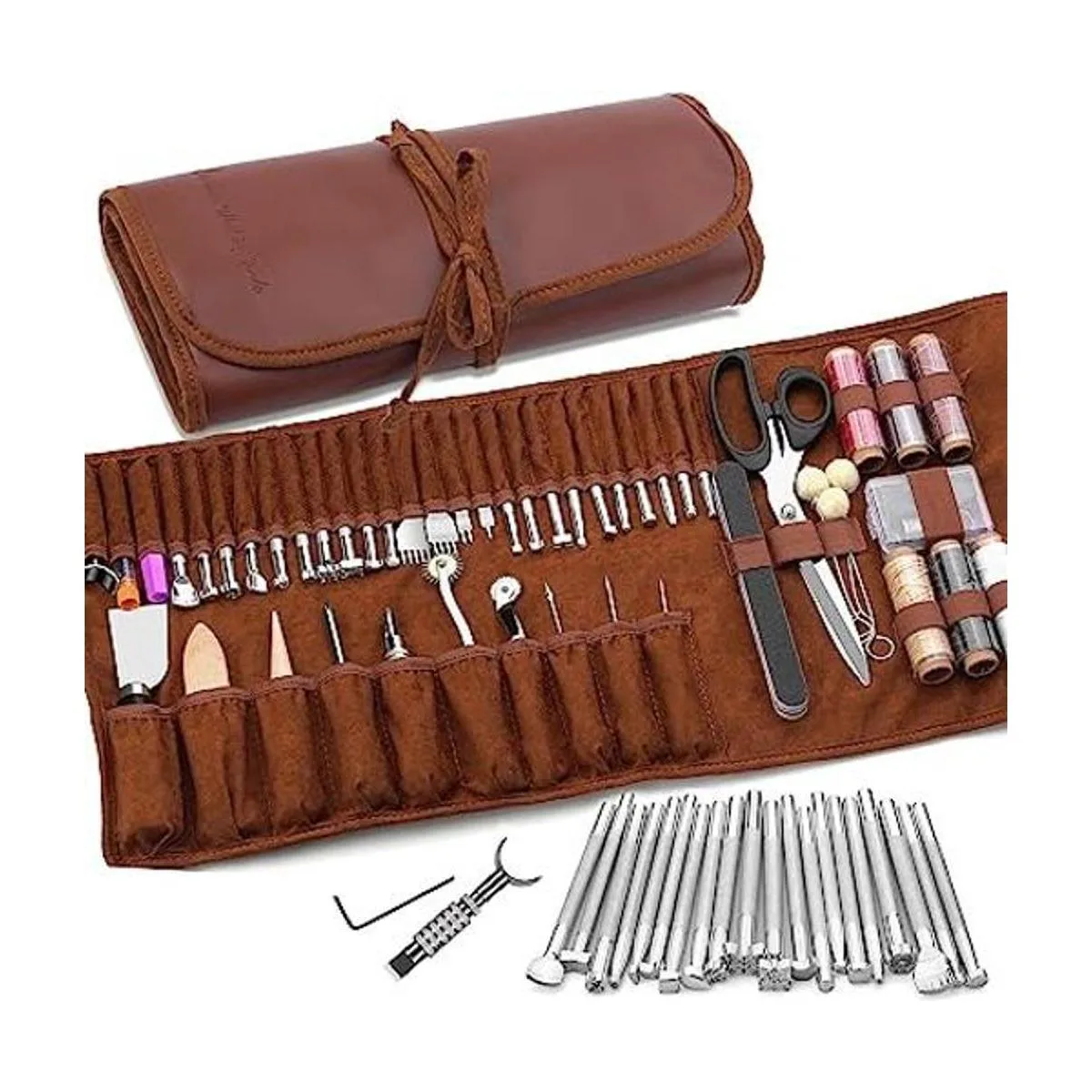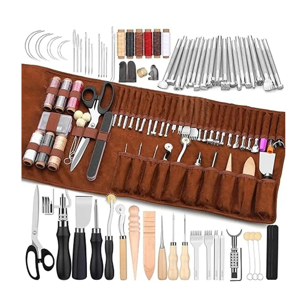 TLKKUE Herramientas de cuero para manualidades, kit de herramientas de trabajo de cuero con bolsa de almacenamiento personalizada, herramientas de tallado de cuero, fabricación de manualidades de cuero para cortar, punzonar, costura, tallado, estampado, kit de herramientas de cuero