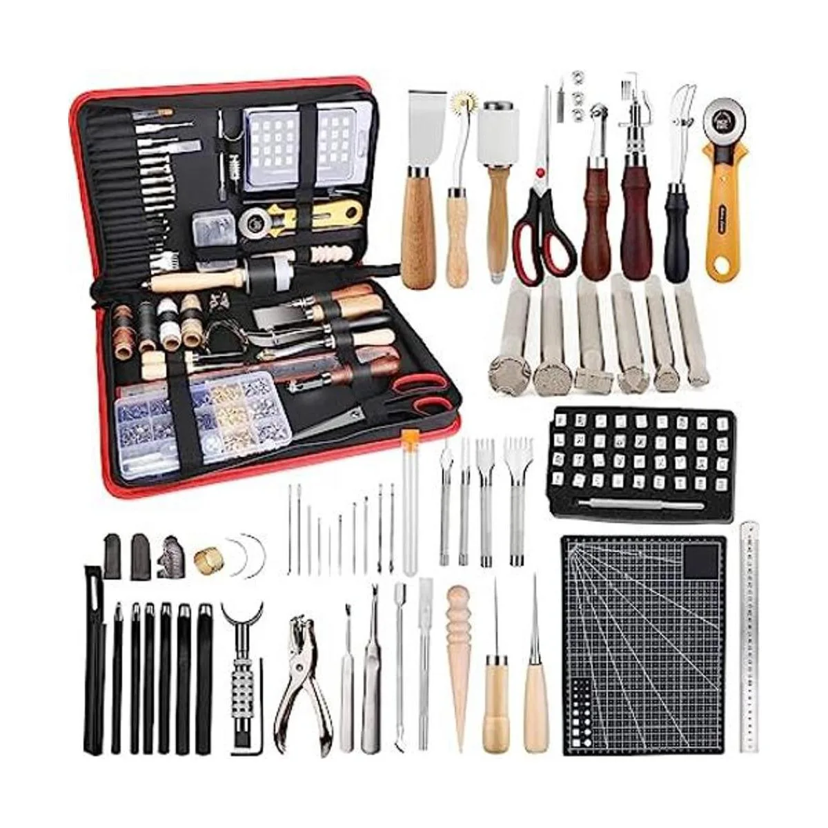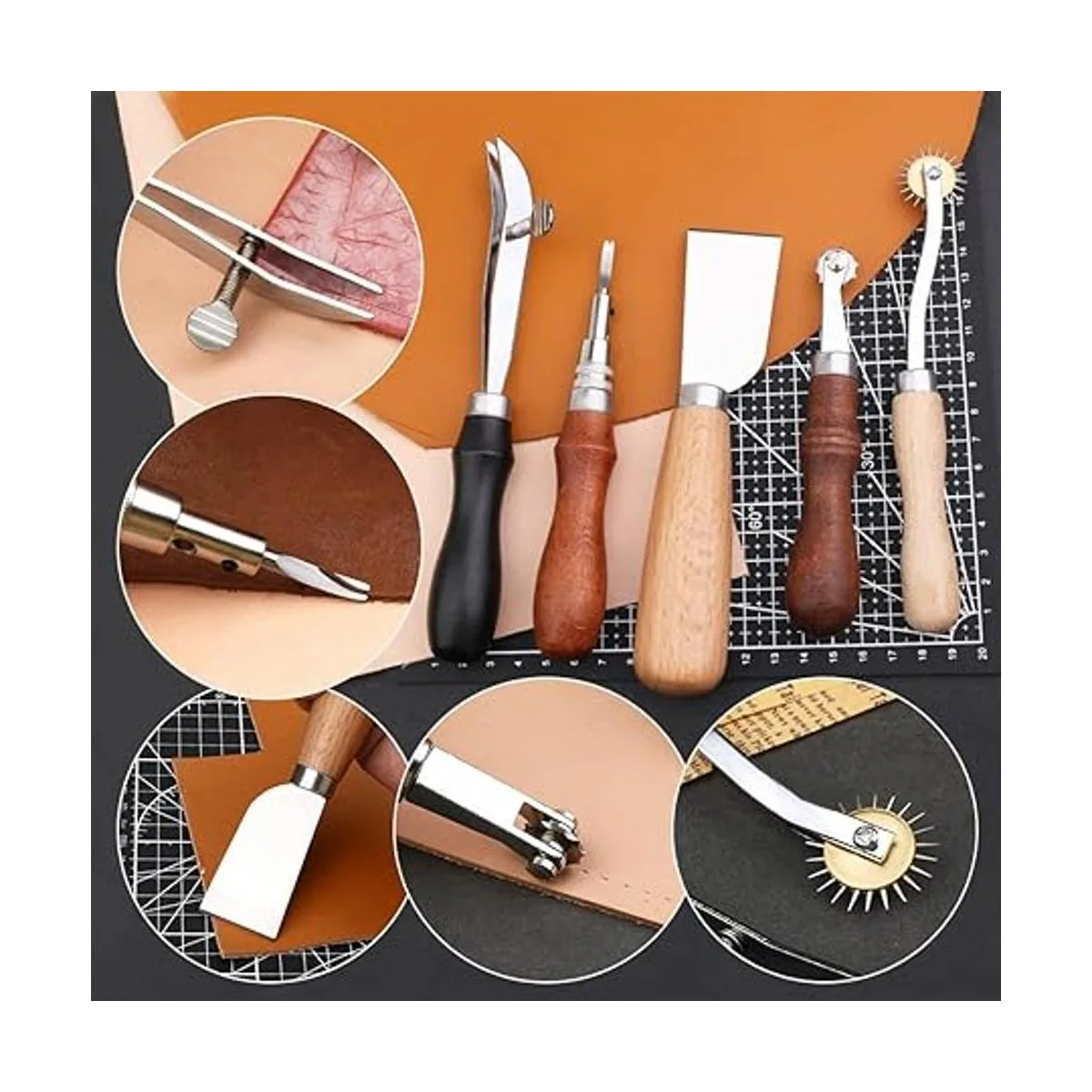 Leather Crafting Tools and Supplies: This leather tool kit is also great for beginners, the handles of the tools are comfortable to hold and ergonomically designed to save time and effort when beginners work. Equipped with selfhealing cutting mat, carving knife edge cutter, edge cutter, 7 and 1 multifunction groover, sewing awl, hole punch, scribing wheel, edge holder, carving knife, leather hammer, leather knife, rotary carving knife , roller knife, wax thread, leather needle, etc.