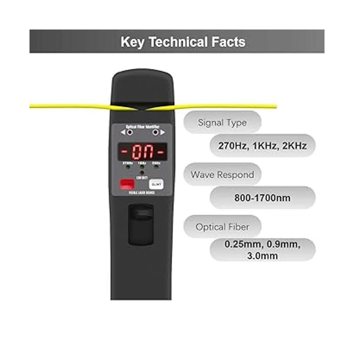 Datos técnicos clave: tipo de señal identificada: 270 Hz, 1 kHz y 2 kHz; respuesta de onda: 800 nm1700 nm, aplicación de fibra óptica: 0.010 in/0.035 in/0.118 in; VFL integrado: 10 mW.