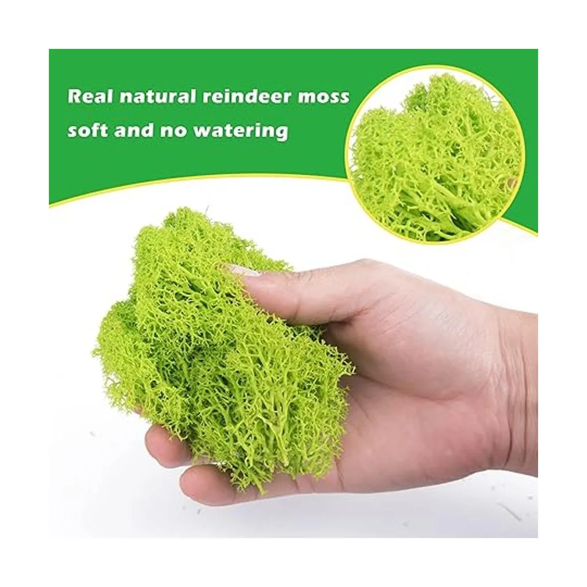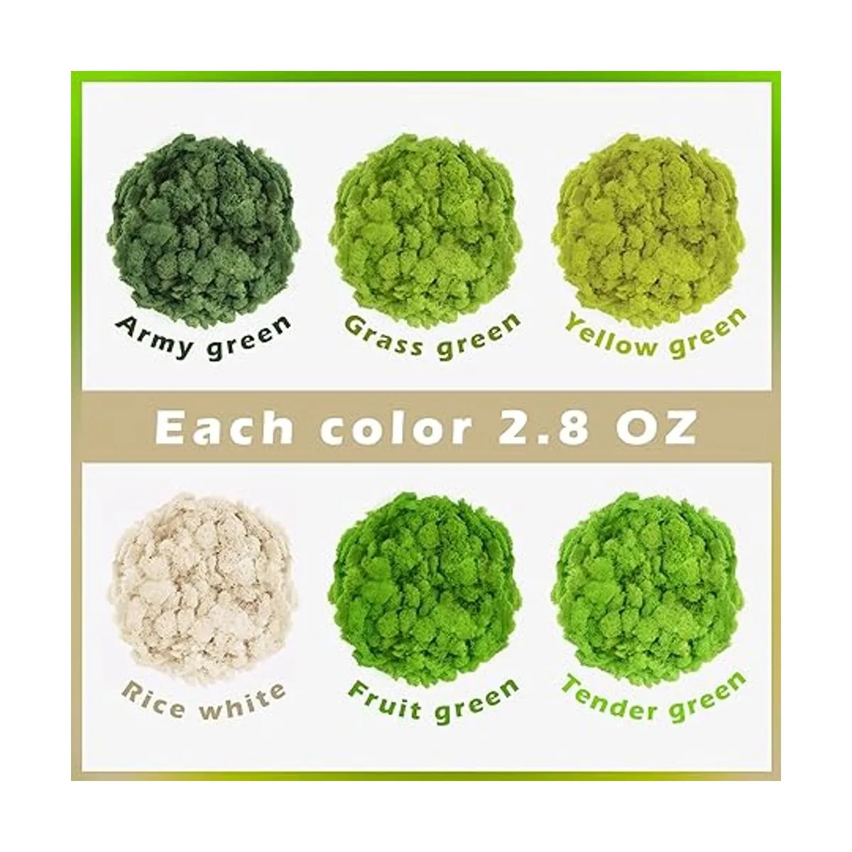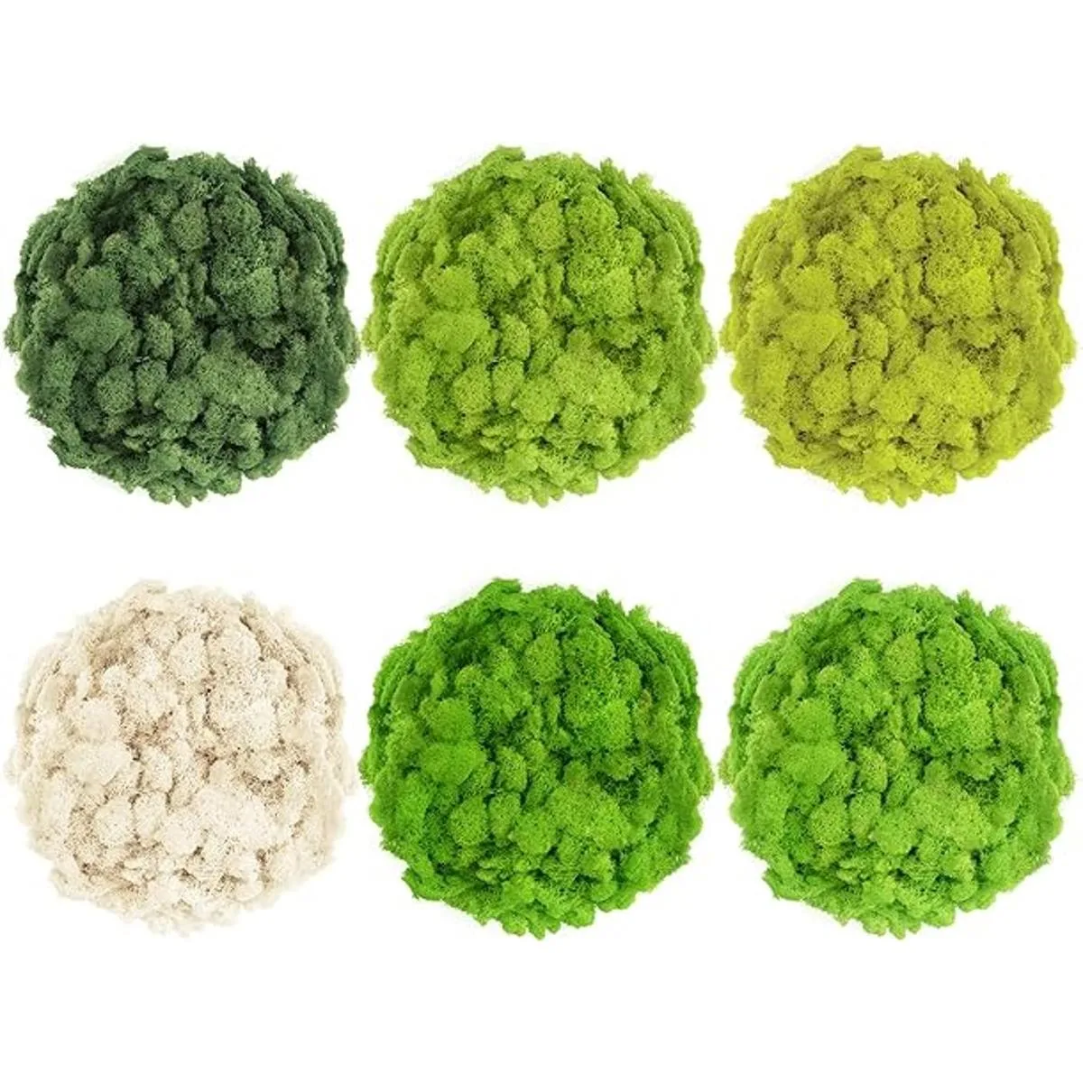 El paquete incluye: recibirás 6 colores de musgo de reno, verde militar, verde fruta, verde tierno, verde hierba, verde amarillo, blanco arroz. Colores brillantes y cantidad suficiente para satisfacer nuestras necesidades diarias de decoración.