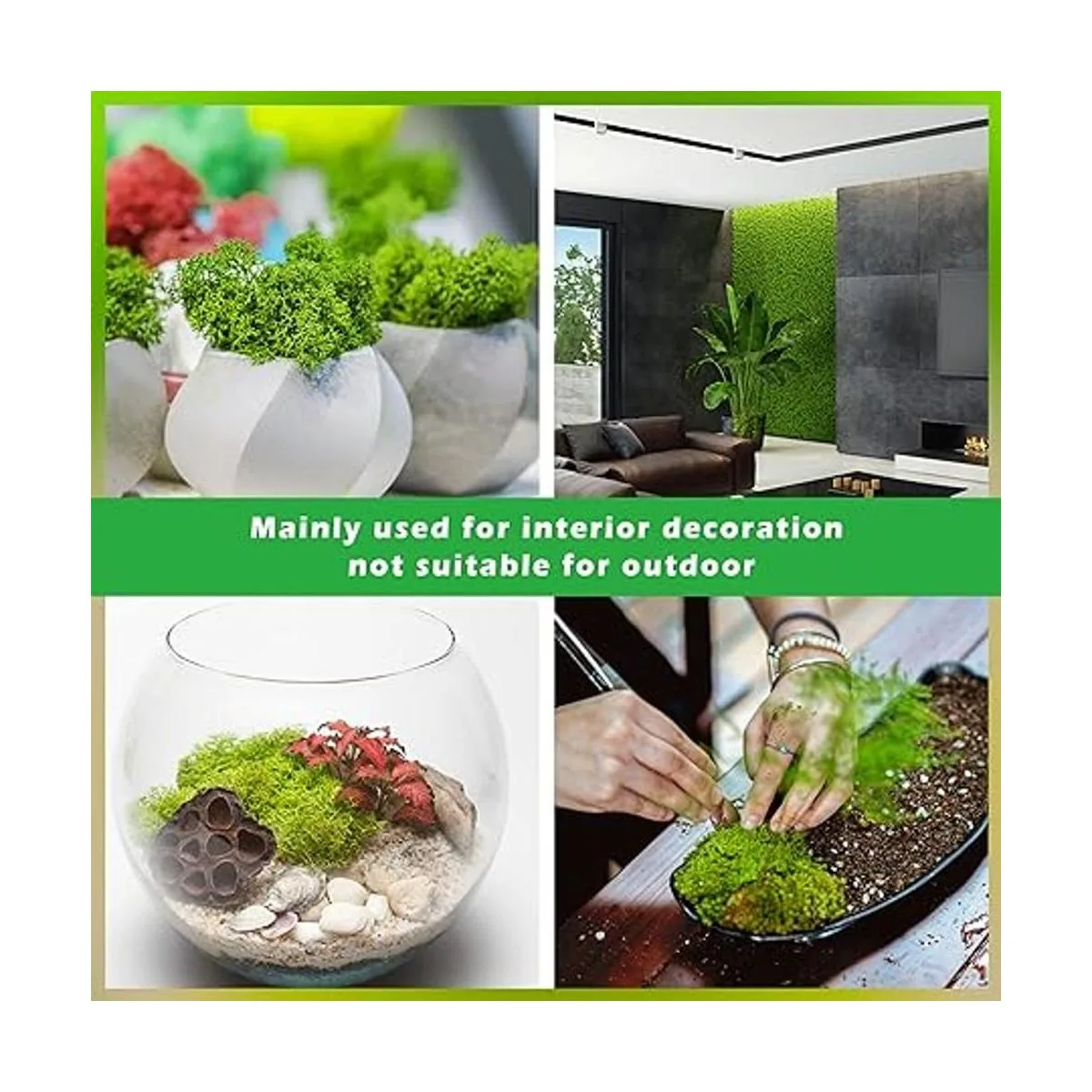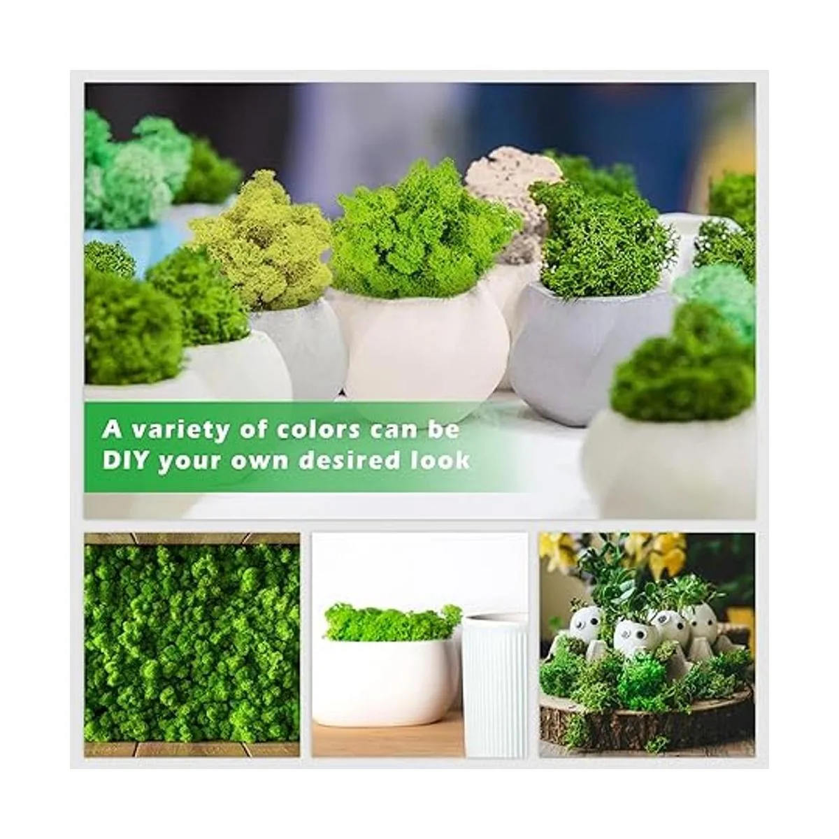 Multiusos: estos musgos multicolor son ampliamente utilizados para decorar plantas en maceta, jarrones, plantas de jardín, arreglos florales, decoración de pared, fiestas, producción de arte, etc. Están llenos de vitalidad y añaden más colores a la decoración de tu hogar.