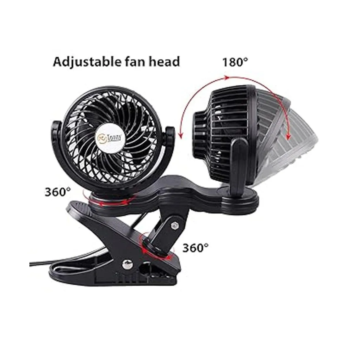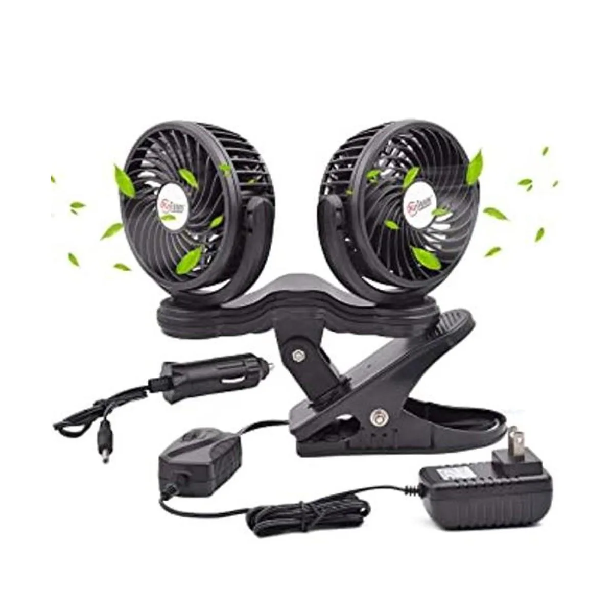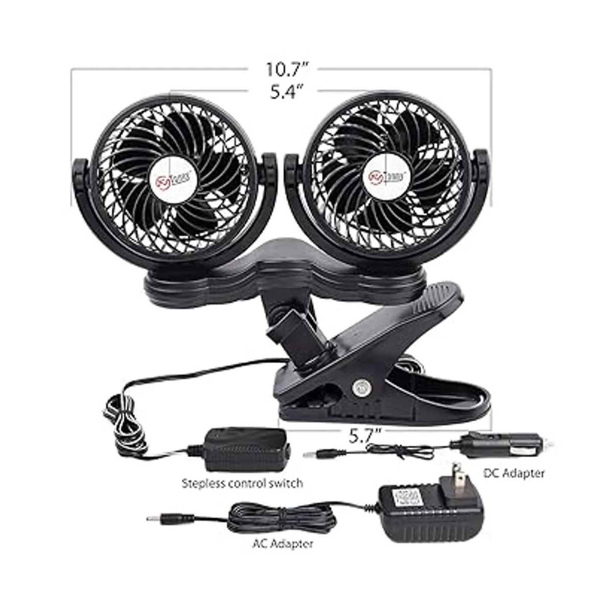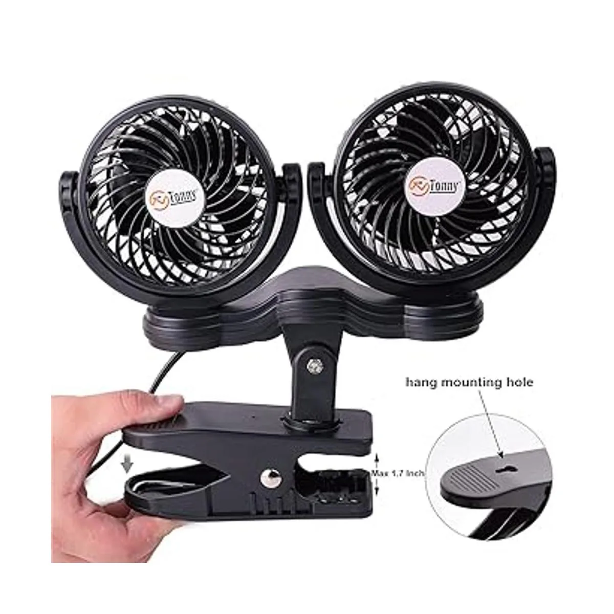 TN TONNY Ventilador de clip de doble cabeza, ventiladores eléctricos de 4 pulgadas con clip de coche giratorio de 360, ventilador de aire de refrigeración de 12 V con regulación de velocidad continua para vehículo o hogar