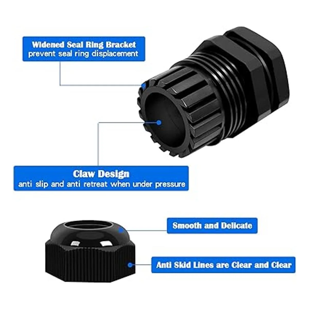 Diseño científico: el interior de cada ojal tiene un anillo de sellado de goma para apretar el conector, diseño impermeable. Amplio rango de sujeción con fuerte resistencia de estiramiento duradero, no causa daños a cables o dispositivos
