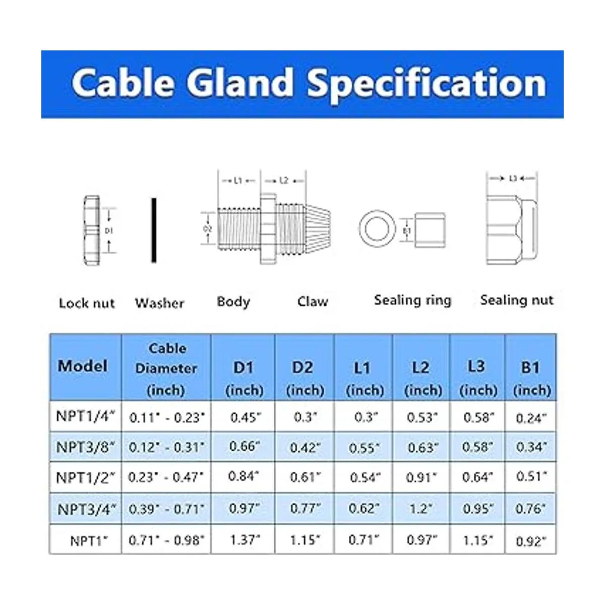 Modelo: NPT 3/8 pulgadas; pasamuros ajustables: 0.118 0.315 in; rosca O.D. 0.638 in; longitud de la rosca: 0.591 in
