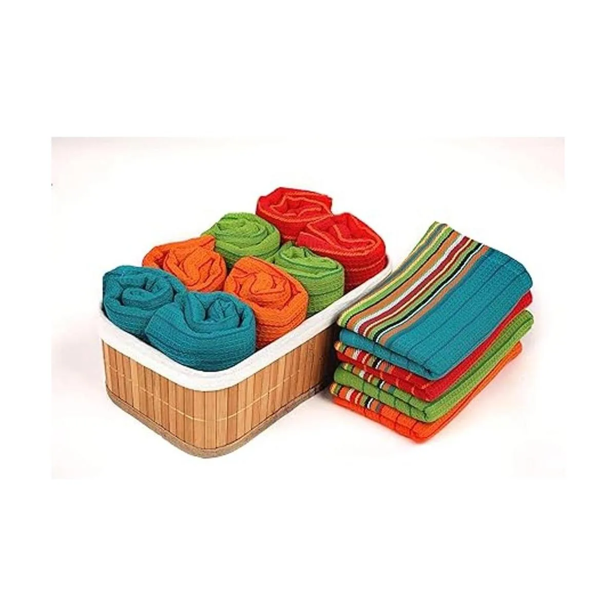 Se ve genial El juego de toallas de cocina incluye tres 3 de cada uno de los cuatro 4 colores: rojo tomate, naranja festivo, verde guacamole y azul turquesa, bellamente elaborado con rayas que corren por el centro de cada toalla.