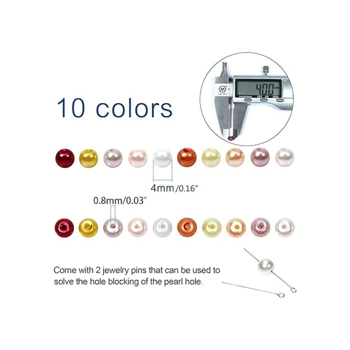 Cuentas de perlas: estas cuentas de perlas para hacer joyas son de aproximadamente 0.157 in de diámetro, y el tamaño del agujero es de 0.031 in. Adecuado para alambre de diámetro inferior a 0.031 in. Total de 10 colores: blanco, marfil, naranja, rosa, morado, amarillo y más, suficiente y vibrante para satisfacer tus diversas necesidades de fabricación de joyas o creaciones de manualidades