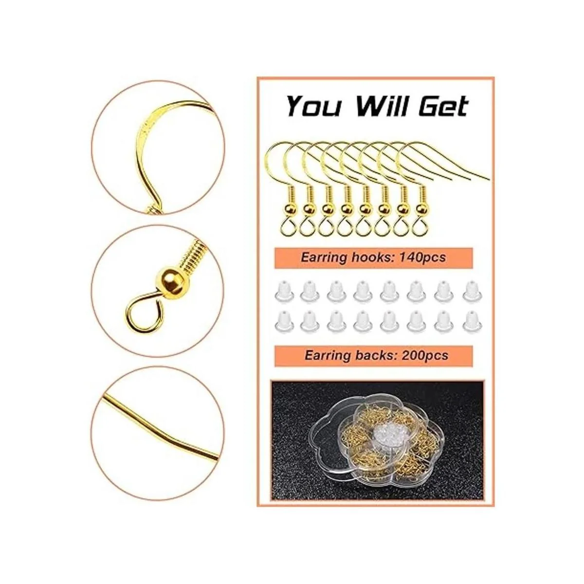 El paquete incluye: El kit de suministros para hacer aretes de 340 piezas en total, con 140 ganchos para aretes, 200 piezas de silicona transparente, perfecto para tu proyecto de joyería. Suficiente para tu repuesto y reemplazo, mantiene un uso prolongado