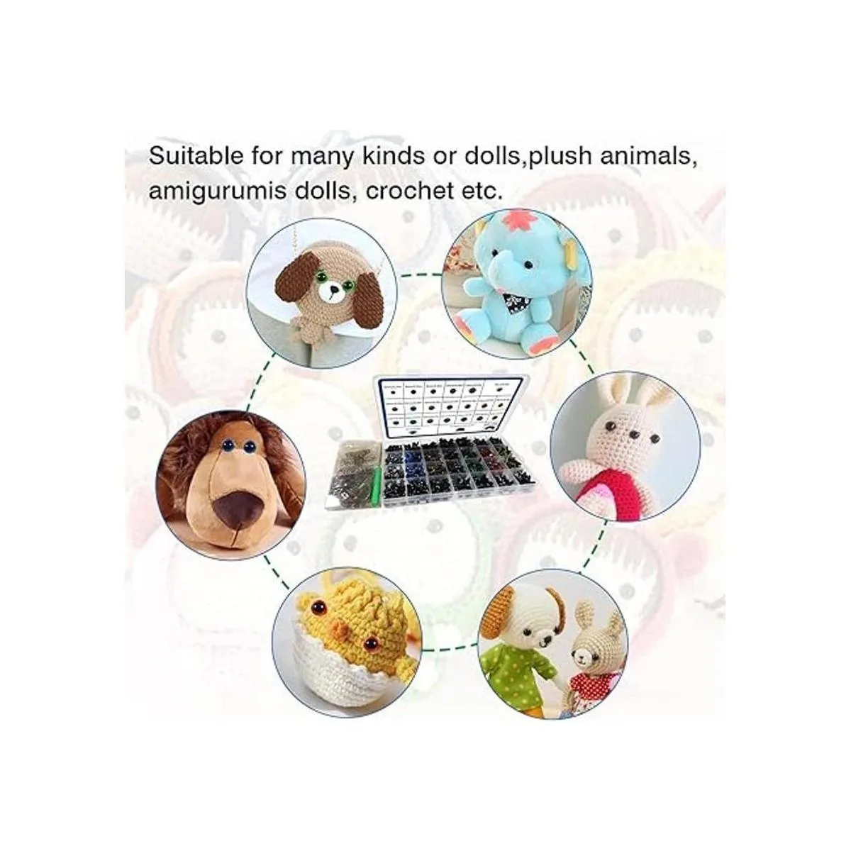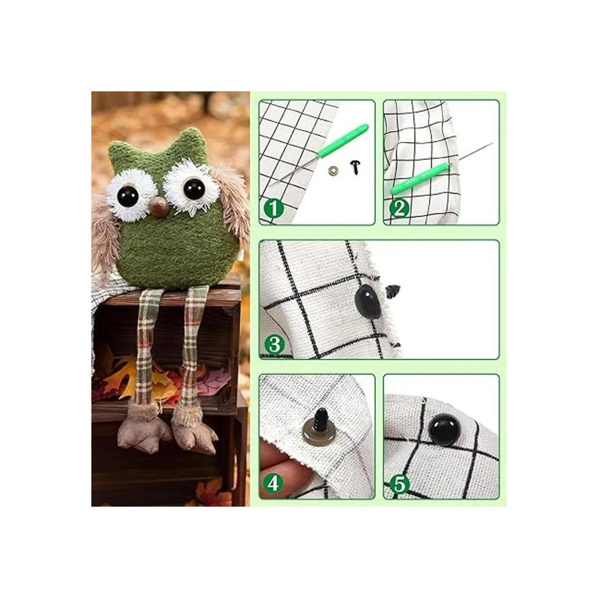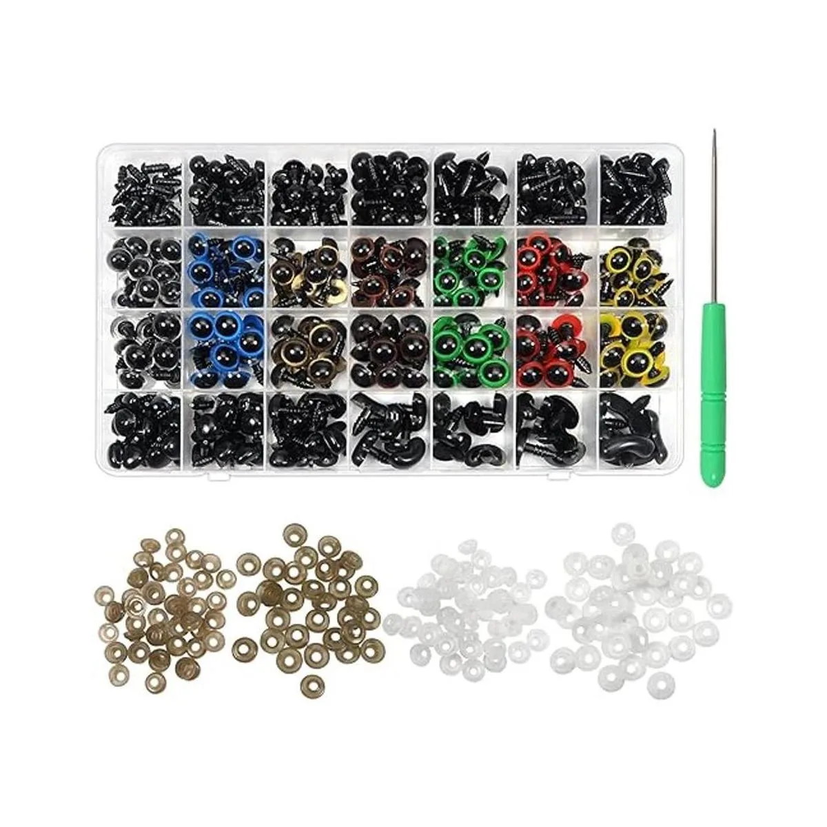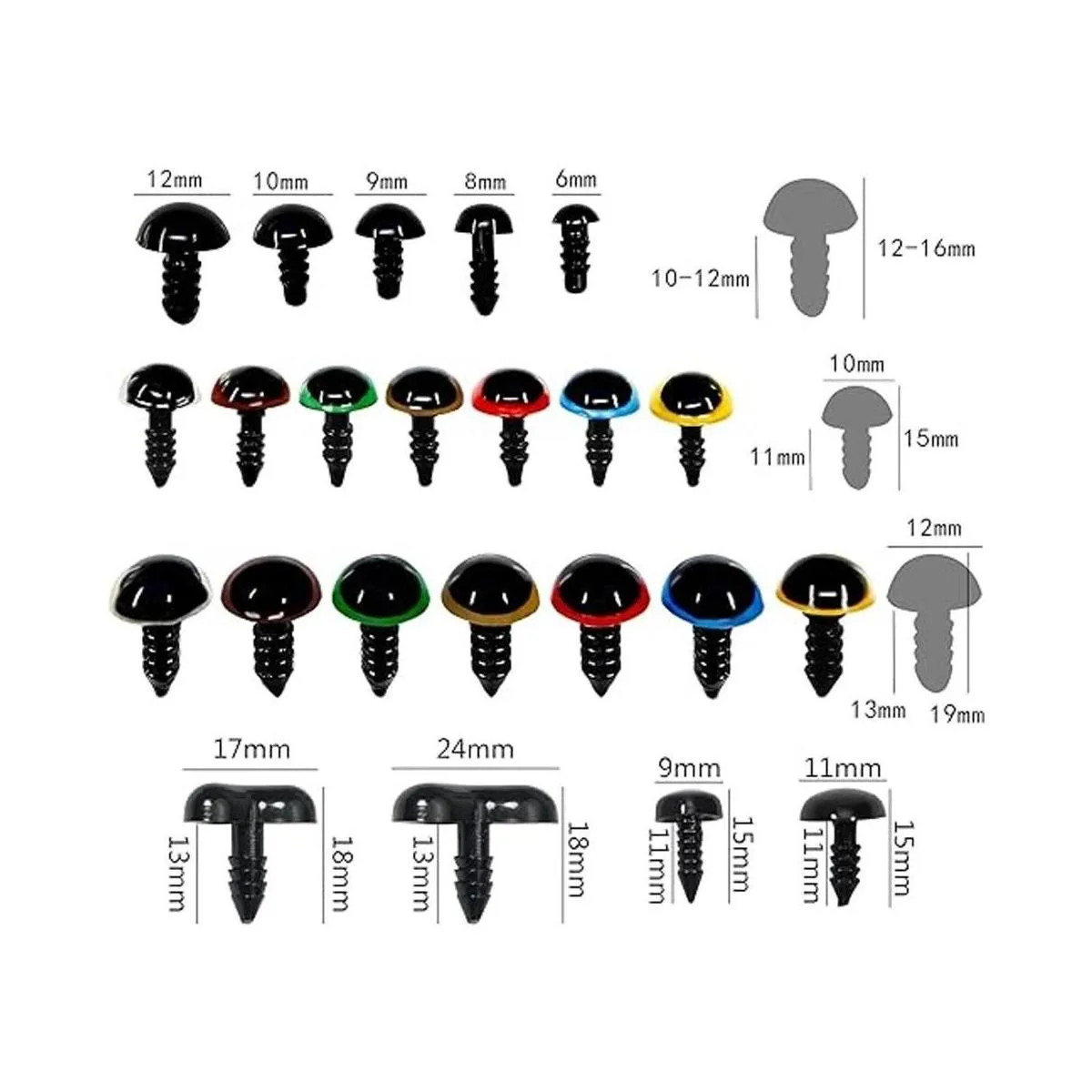 Lo que obtendrás: 94 ojos de seguridad de plástico negro de 6 a 0.472 in 100 ojos de seguridad de plástico coloridos de 0.394 in 70 ojos de seguridad de plástico coloridos de 0.472 in 100 narices de seguridad negras 26 narices curvadas negras 390 arandelas en 4 estilos