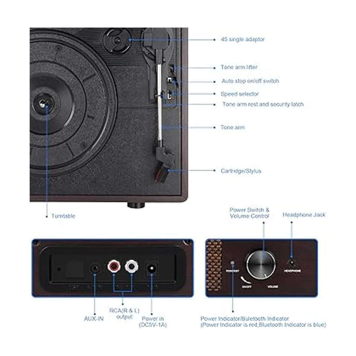 Tocadiscos todo en uno: Entrada Bluetooth y entrada de audio AUX y salida de línea RCA y toma de auriculares. 2 altavoces estéreo incorporados, con tecnología inalámbrica Bluetooth, para escuchar con elegancia la música de tu smartphone. Utiliza la entrada del cable auxiliar para reproducir directamente la música. O disfruta de tu tiempo con los auriculares. Para obtener un sonido mejor o más fuerte, conecta un altavoz externo mediante un cable RCA.