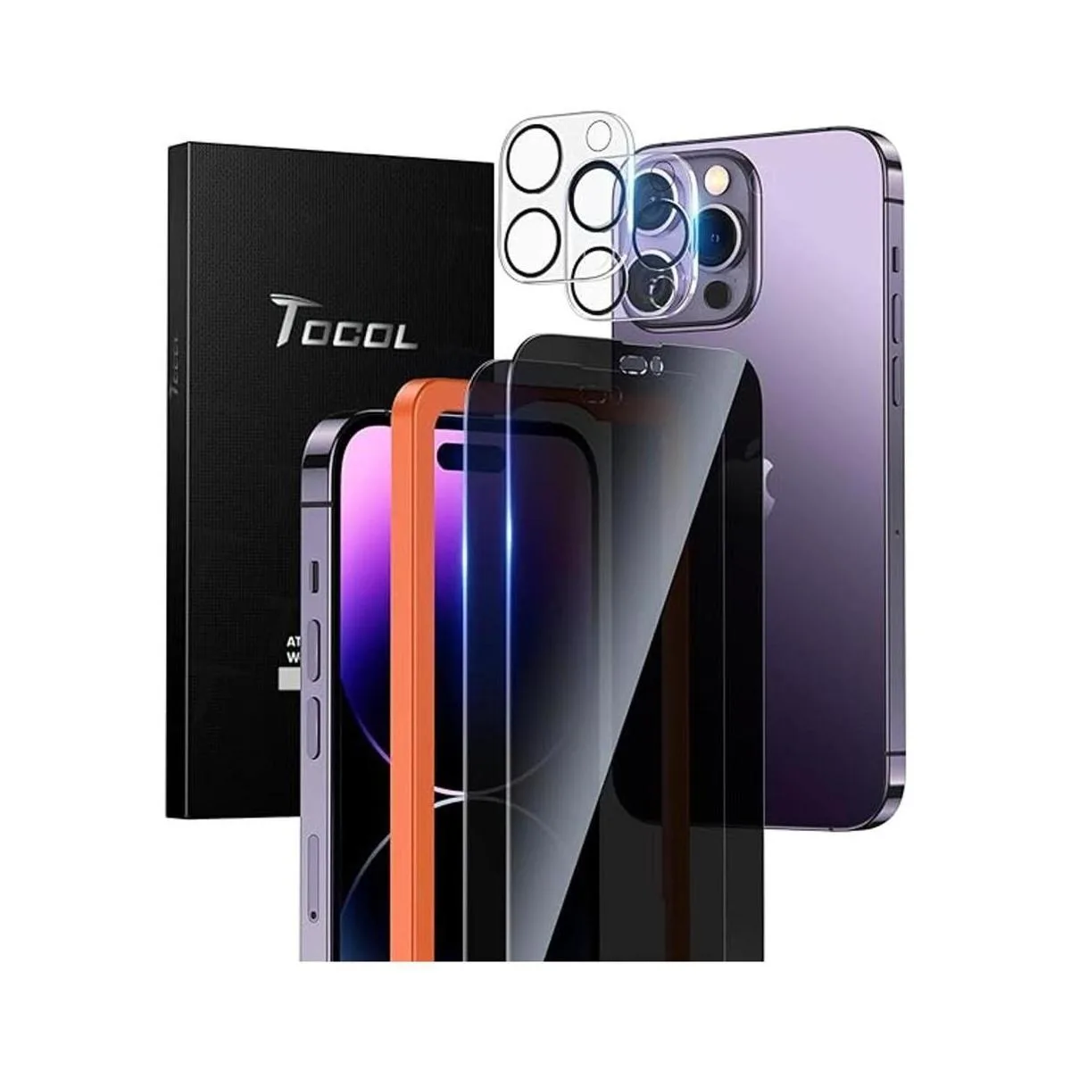 TOCOL 22 Protector de pantalla de privacidad para 14 Pro Max de 6.7 pulgadas, 2 protectores de pantalla de vidrio templado de privacidad y 2 protectores de lente de cámara, sin burbujas, 10 veces a prueba de golpes, marco de instalación, antiespía