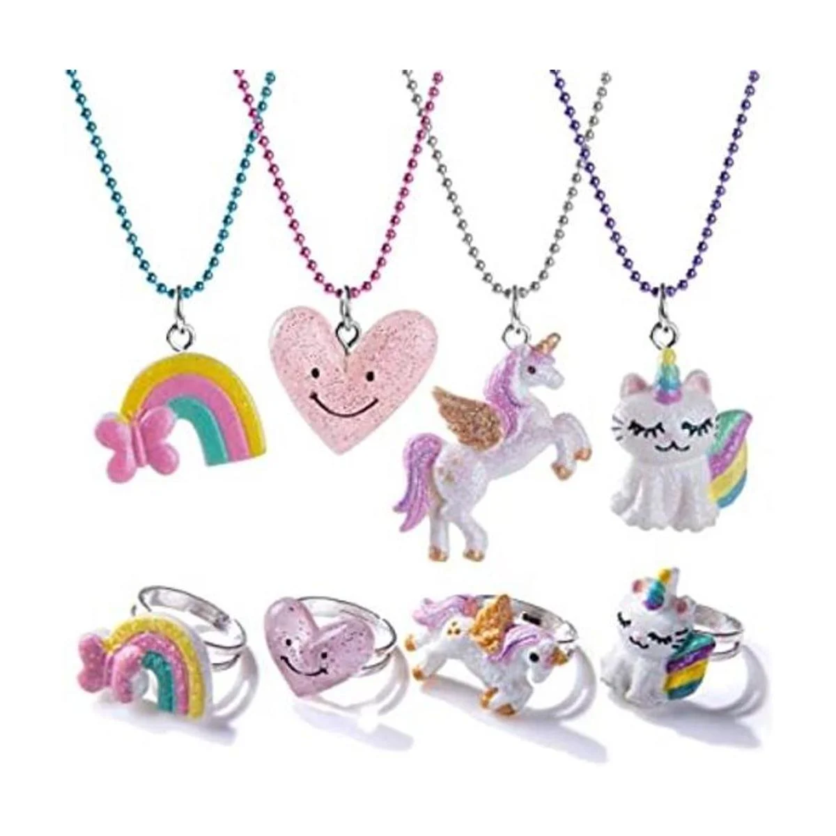 Todder Juego de joyas para niñas, collar de unicornio para niñas, conjunto de anillos de collar de corazón de BFF para mujer, juego de anillos de recuerdos de fiesta, amistad, simulación, joyería de juego, Aleación, resina