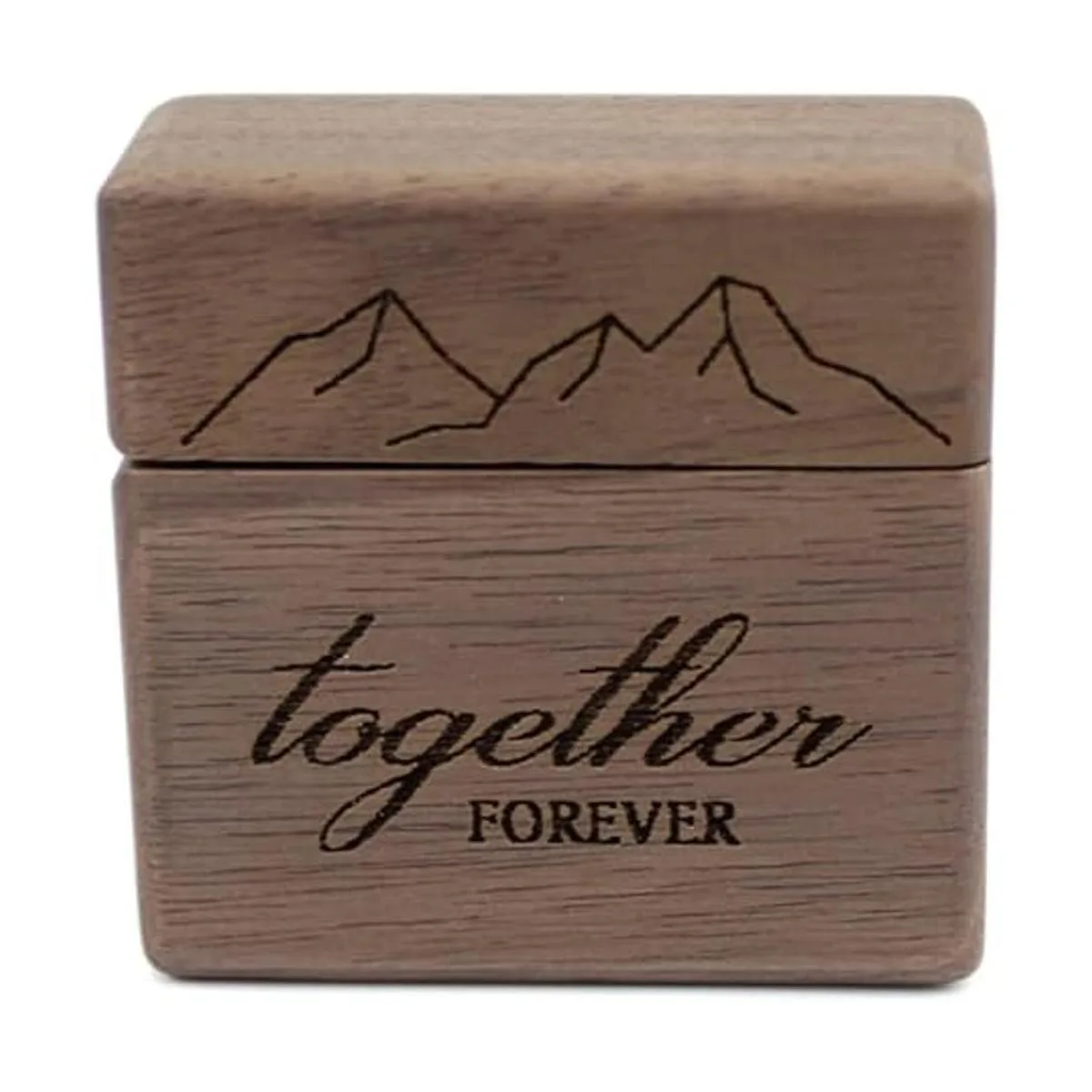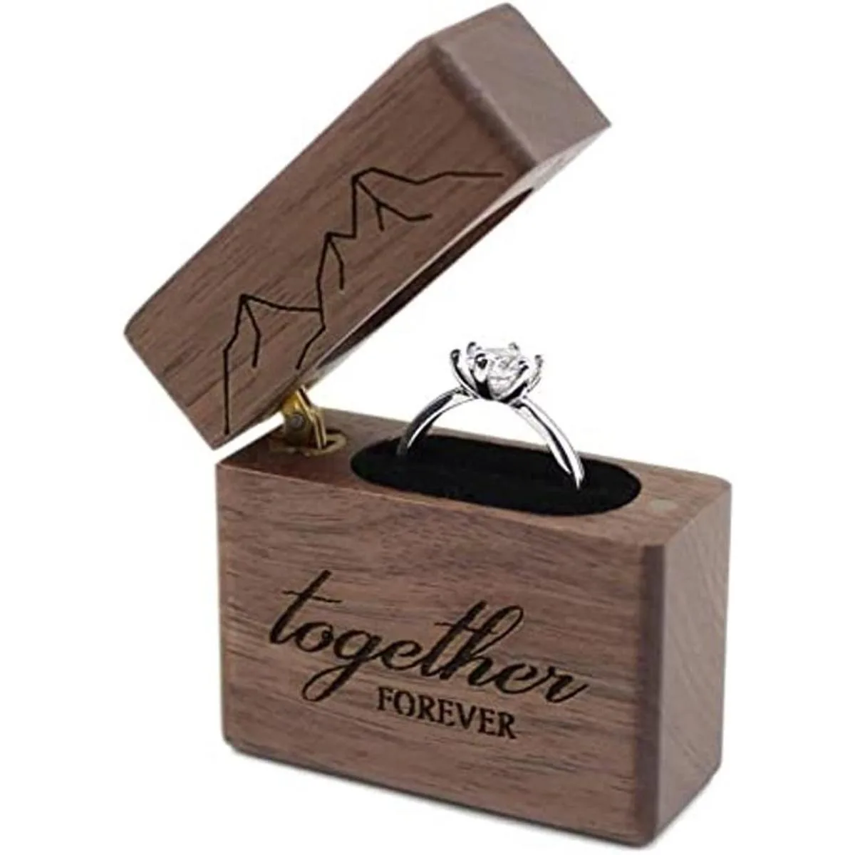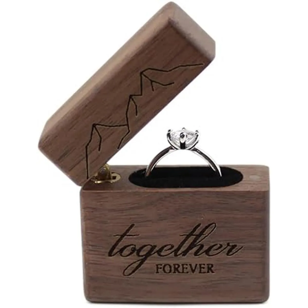 Together Forever Caja de anillos de compromiso de madera grabada, caja de anillos con tapa abatible de nogal para almacenamiento de anillos de boda