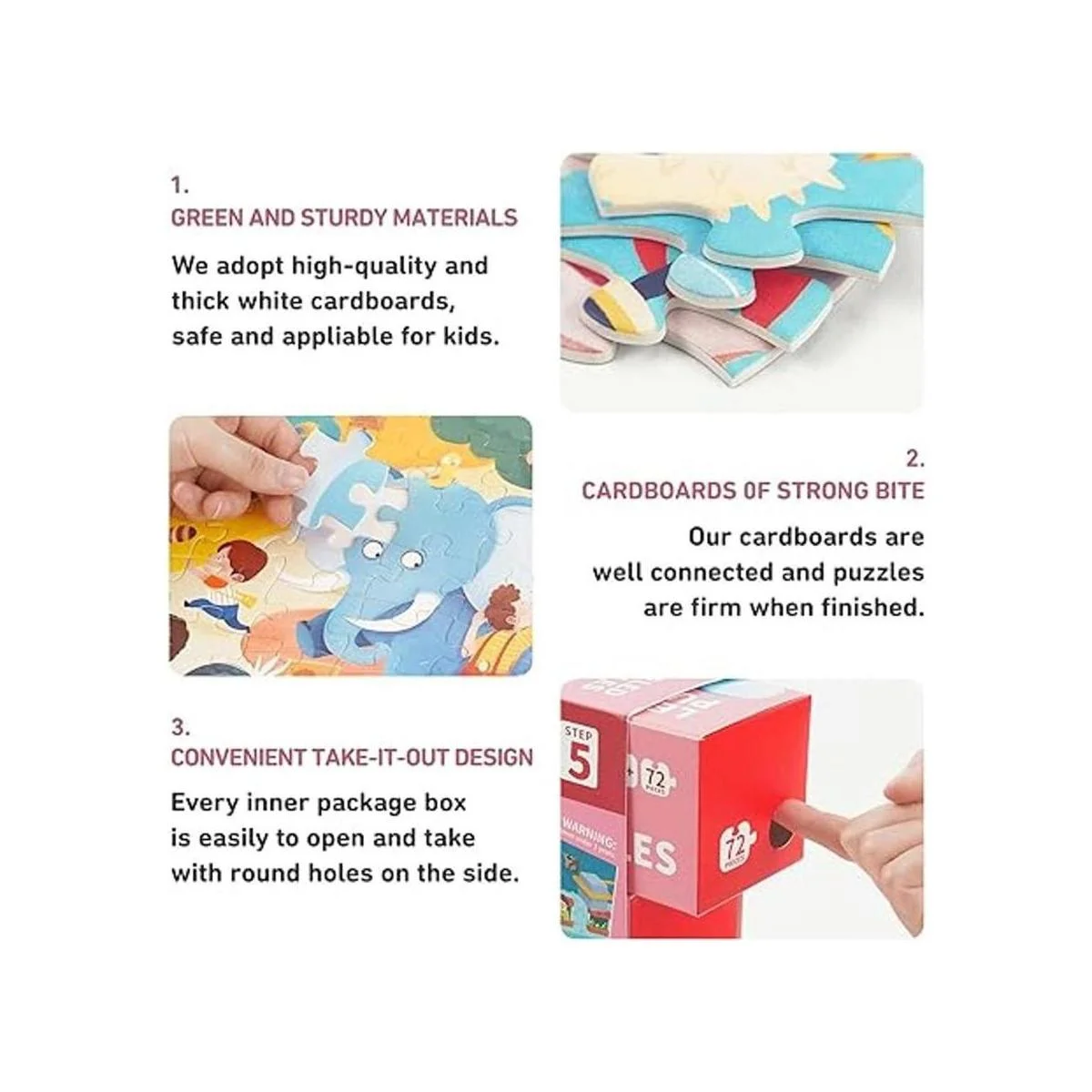 Elección segura Adoptamos cartón grueso de alta calidad, haciendo que los bordes sean suaves y sin rebabas. Cuanto más bajos sean los pasos, menos y más grandes serán las piezas del rompecabezas para evitar que los niños se traguen. Los rompecabezas Toi están certificados por CPC, EN71, TUV, ITS y ASTM. No te preocupes por jugar.