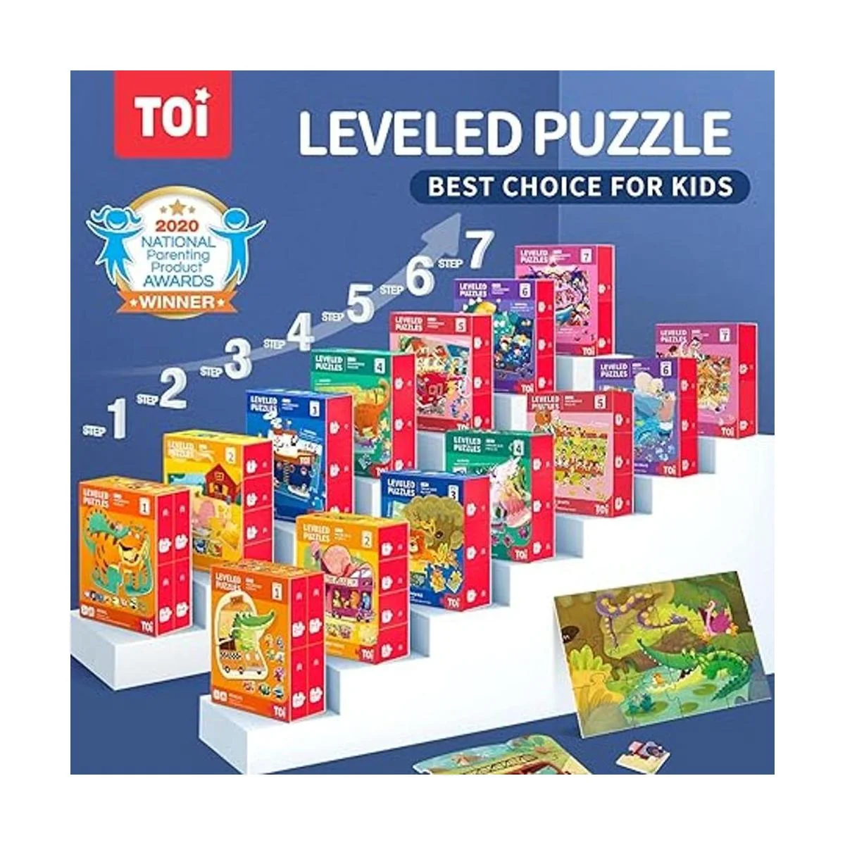 Rompecabezas nivelados Los rompecabezas para niños están diseñados como 7 pasos, correspondientes a niños de 2 a 8 años. La dificultad aumenta gradualmente con pasos, incluyendo piezas. Elige rompecabezas de bajo paso para niños pequeños de 2 a 4 años, o principiantes de rompecabezas, para desarrollar su interés y construir confianza.