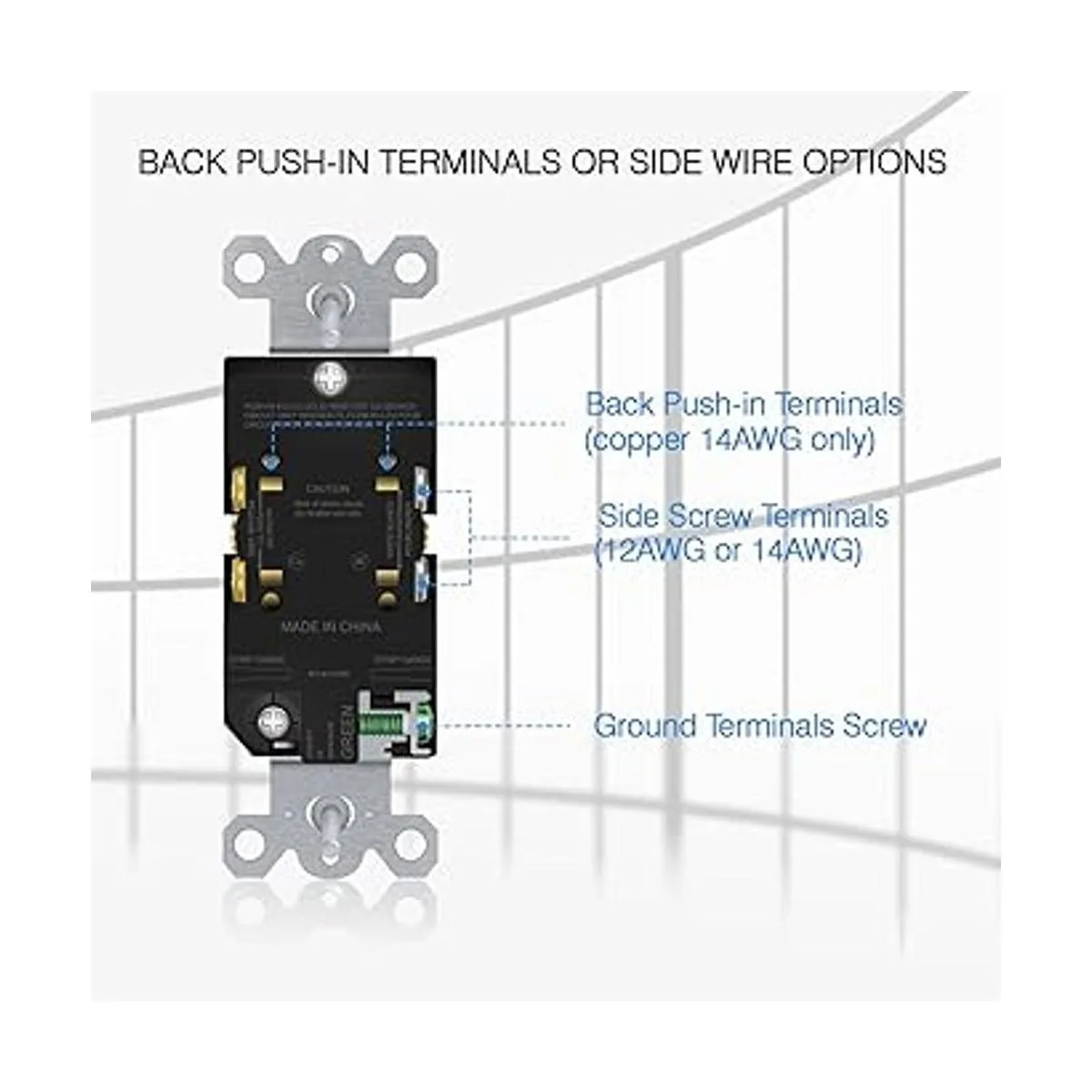 Fácil instalación: el diseño de cuerpo poco profundo permite un cableado compacto. Los terminales de cableado rápido aceptan solo alambre de cobre sólido 14 AWG. Los tornillos de terminal de cableado lateral aceptan cable hasta 12AWG. Los clips de conexión a tierra hacen que sea fácil de instalar en cajas de metal y se pueden instalar en cualquier caja eléctrica estándar con confianza