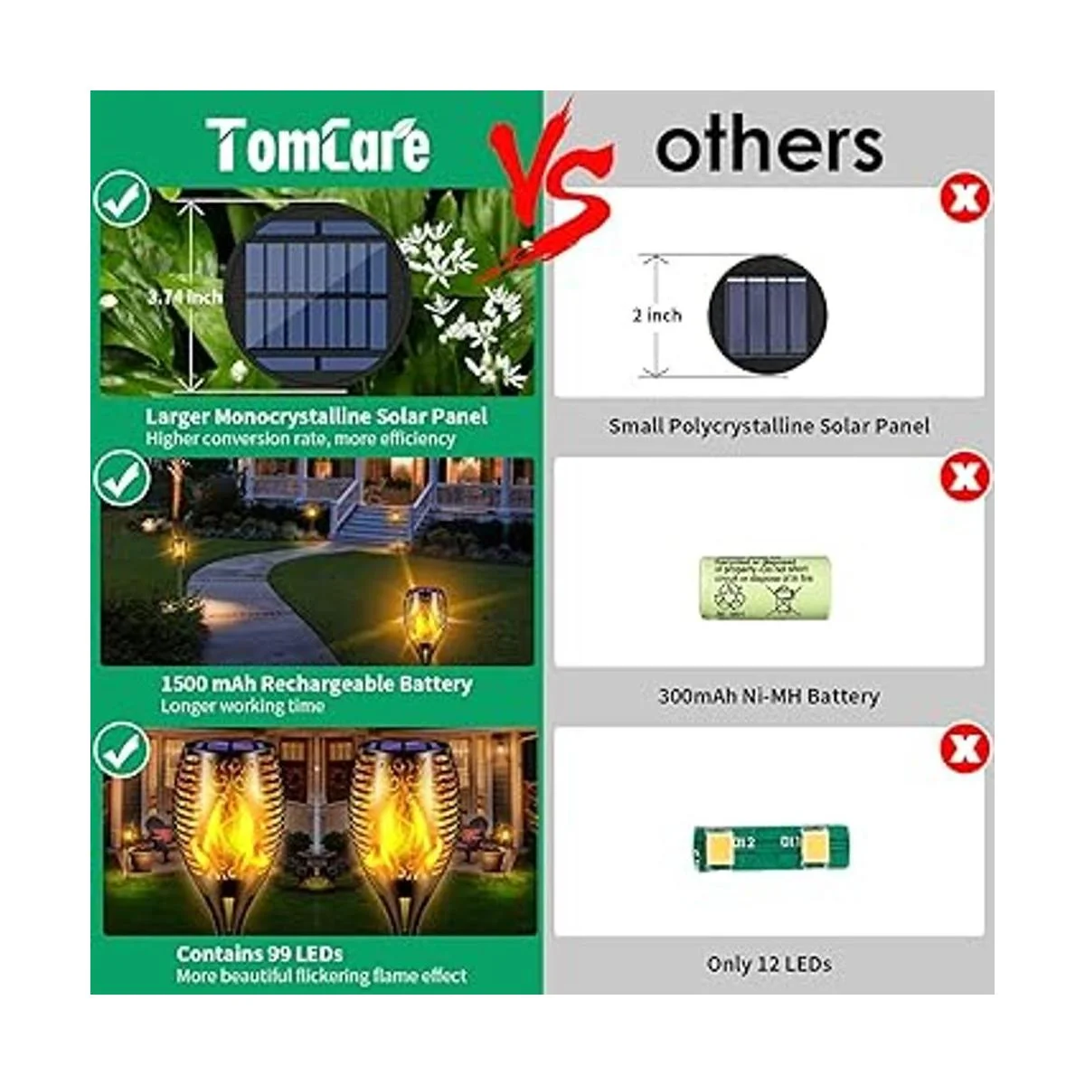 TomCare Luces solares 99 LED más altas y más grandes de llama parpadeante, luces solares de antorcha de 43 pulgadas, impermeable, iluminación al aire libre, luces de camino alimentadas por energía solar, decoración de paisaje para jardín, patio, Halloween, paquete de 4