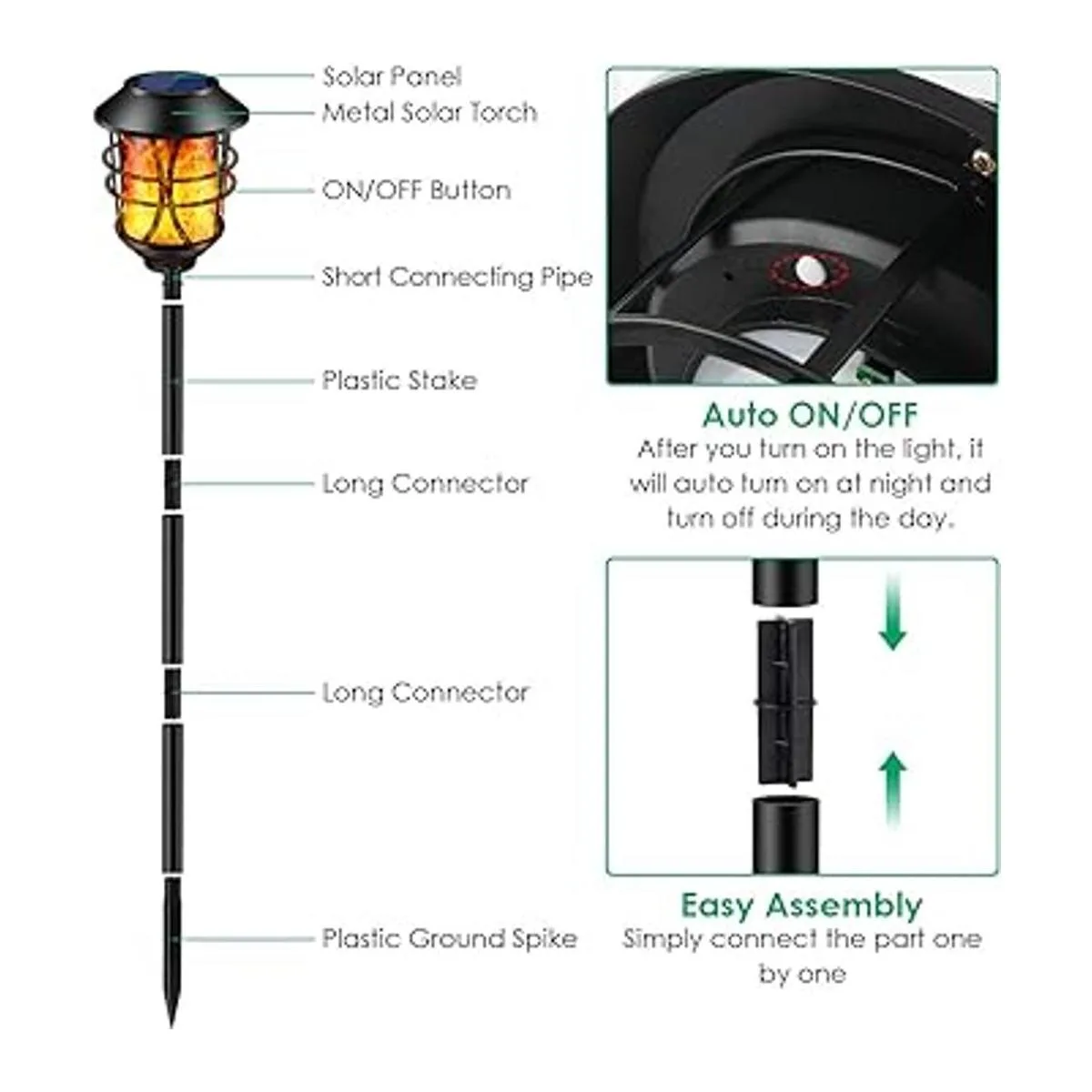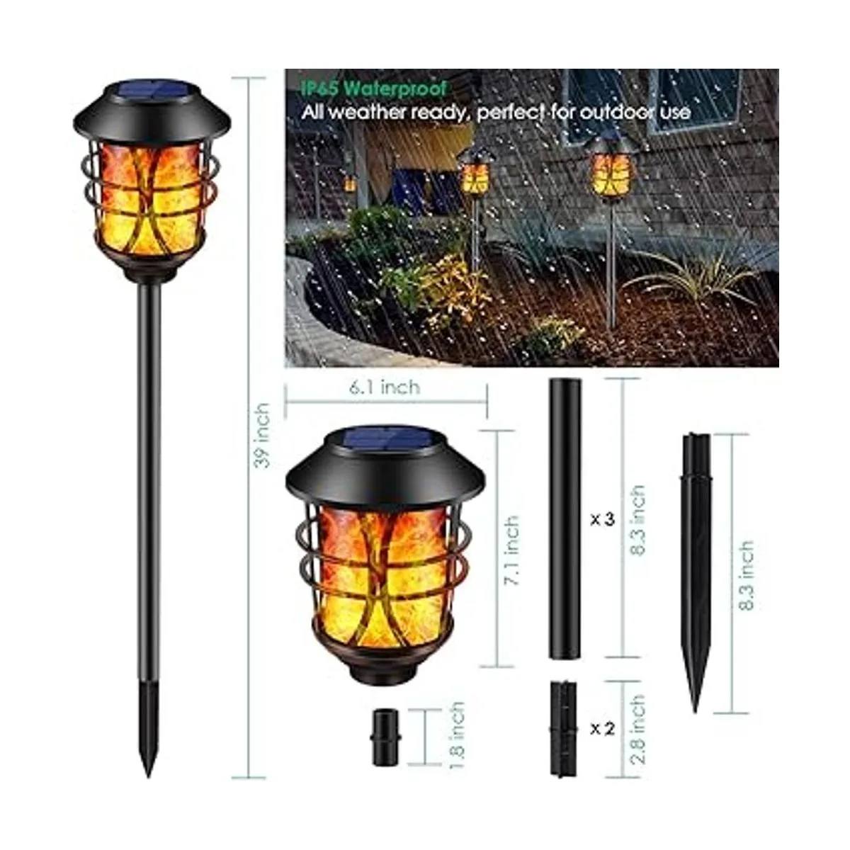 Linternas solares de metal: hechas de material de metal de calidad, acabado con revestimiento negro resistente a la corrosión, esta luz solar de llama es duradera para uso en exteriores. Y las estacas y postes están hechos de plástico ABS de alta calidad. Además, su nueva versión parece más elegante y con estilo. Esta es la mejor decoración para tu casa.