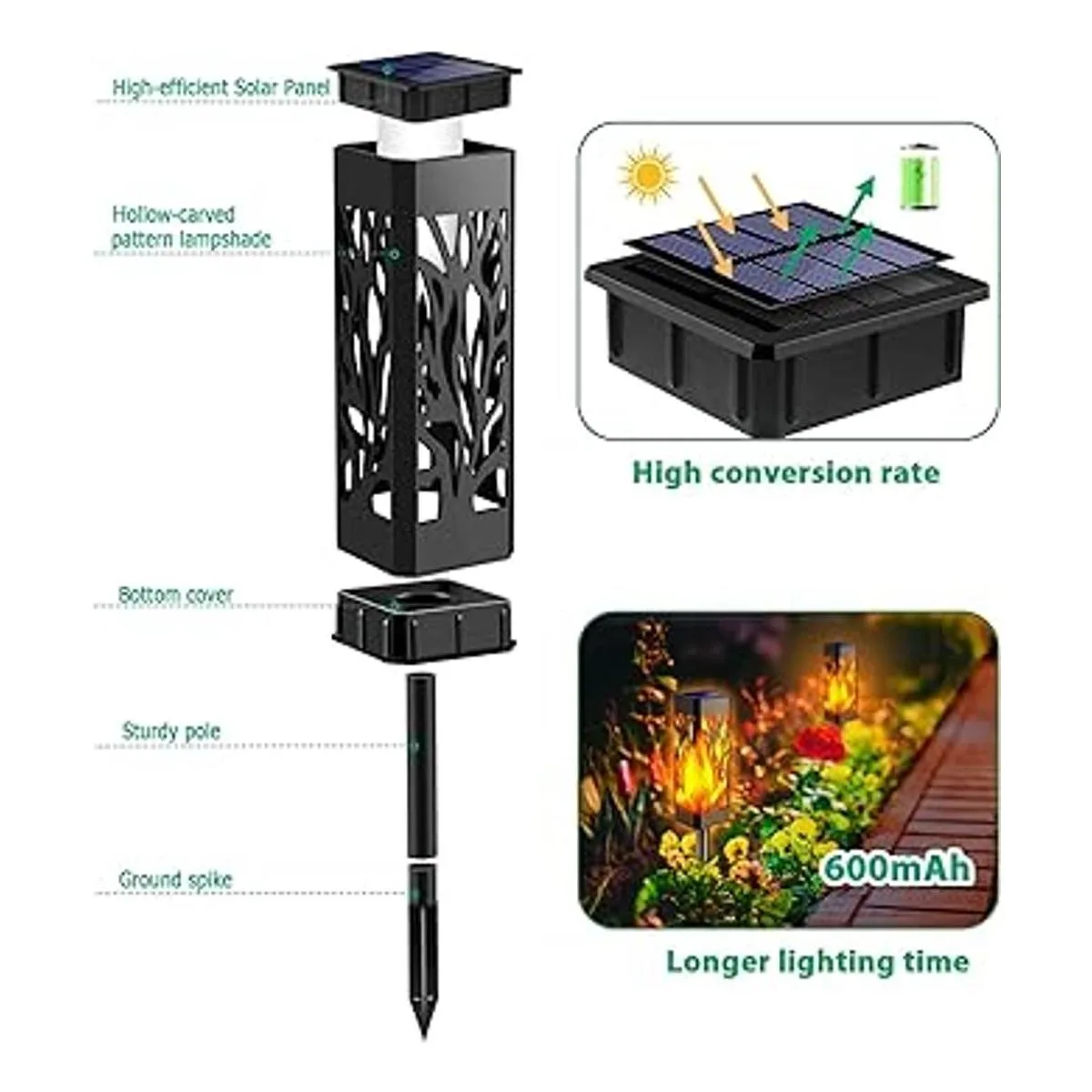 Funciona con energía solar y alta eficiencia: estas luces solares de camino con paneles solares de alta eficiencia, recogen energía solar durante el día y luego se encienden automáticamente por la noche. La batería de 600 mAh permite que estas luces exteriores sean de 8 a 10 horas de tiempo de iluminación después de cargarse completamente. Nota: enciende el interruptor antes de usar