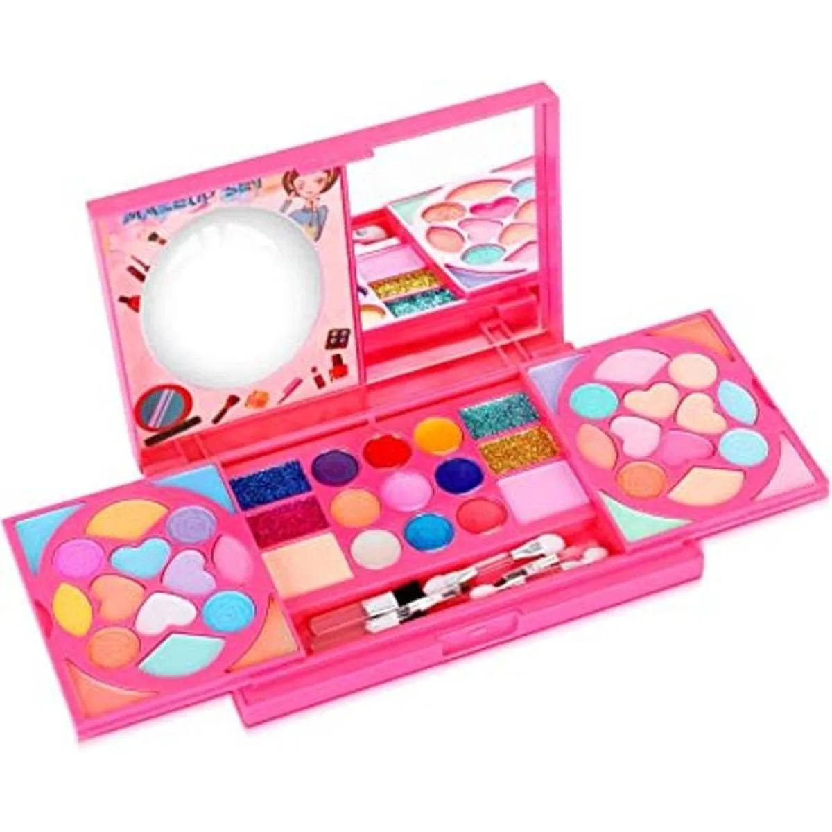 El juego de maquillaje incluye: 32 sombras de ojos, 9 brillos de labios, 4 sombras de ojos brillantes, 23 calcomanías de unicornio, 2 coloretes, con 6 brochas y espejo, perfecto para pequeños principiantes de maquillaje.