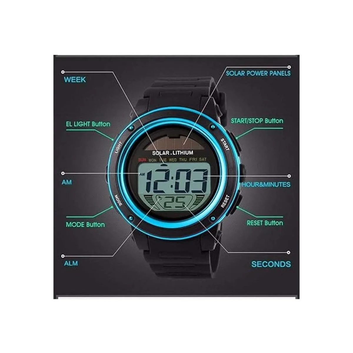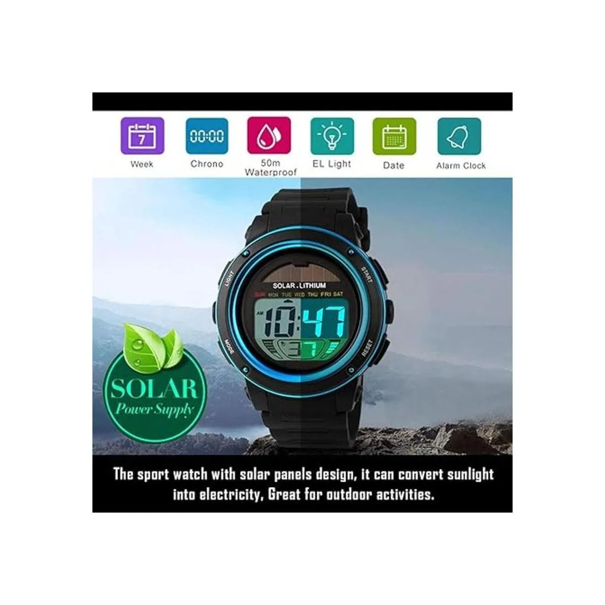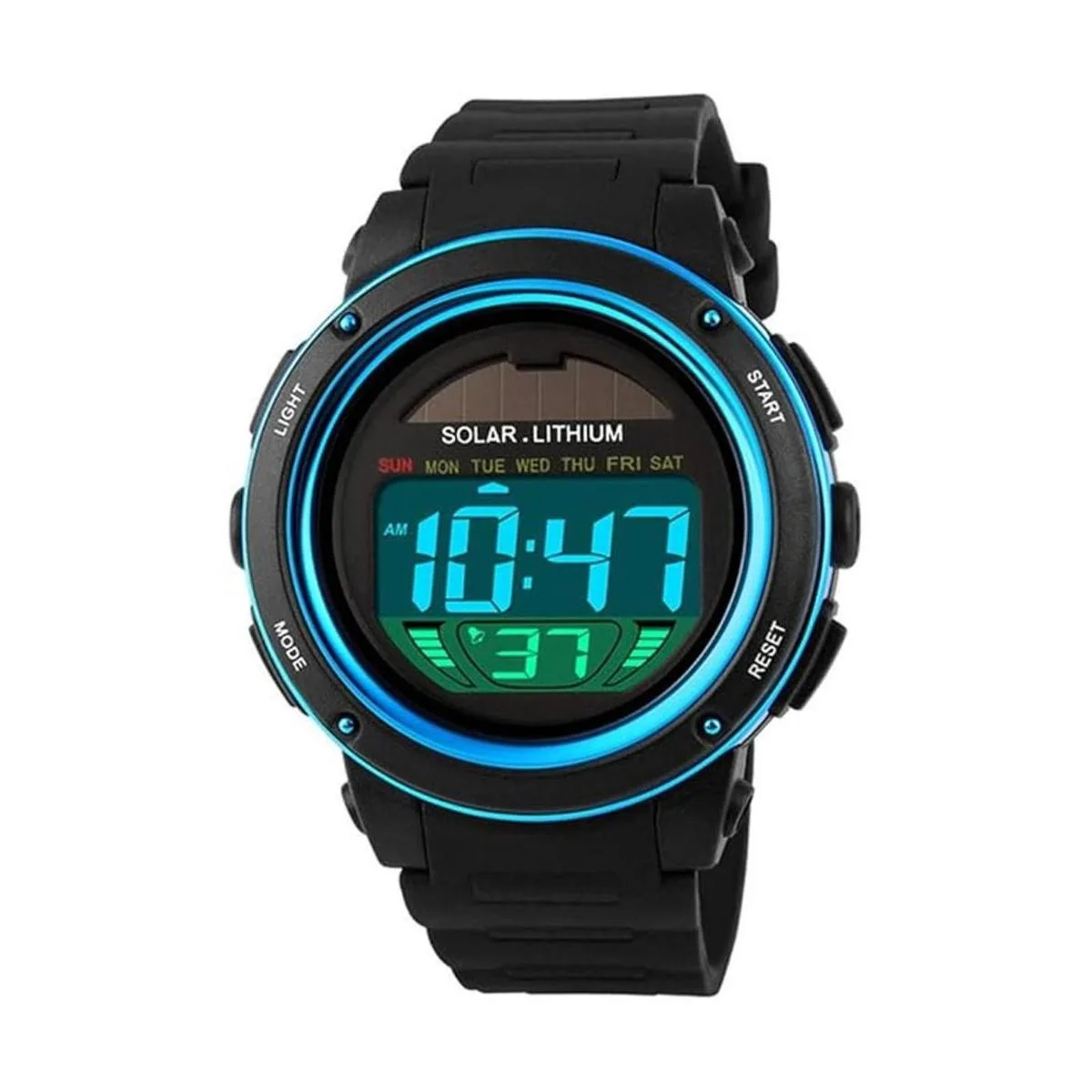 Reloj deportivo multifunción: paneles de energía solar, cronómetro, cuenta atrás, reloj despertador, retroiluminación, resistente al agua, sistema de 12/24 horas, fecha, batería japonesa 2 años de vida.