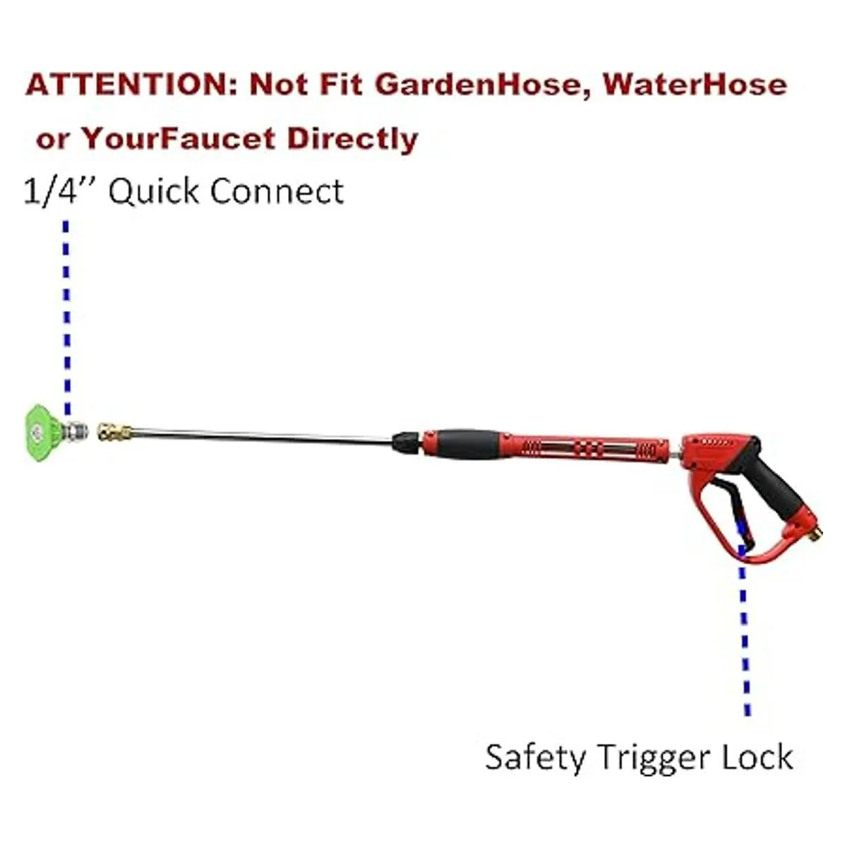 La extensión de la varilla de la lavadora a presión tiene un conector rápido estándar de 1/4 pulgadas. Conecta cualquier accesorio con enchufe de 1/4 pulgadas a la . Como puntas de boquillas, acoplador pivotante, cañón de espuma, varilla de extensión, limpiador de superficies, limpiador de chasis o escoba de agua. Bloqueo de gatillo de seguridad para evitar un funcionamiento no deseado.