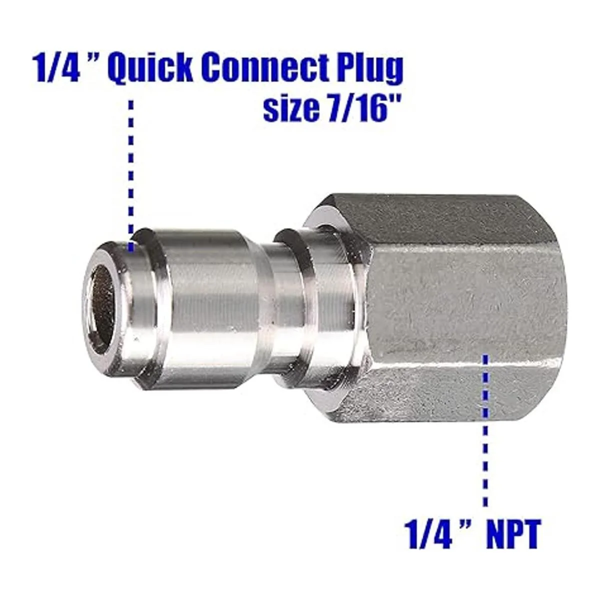 Convierte un enchufe de desconexión rápida de 1/4 pulgadas a un conector NPT hembra de 1/4 pulgadas. Presión de trabajo de hasta 5000 PSI. Está hecho de acero inoxidable.