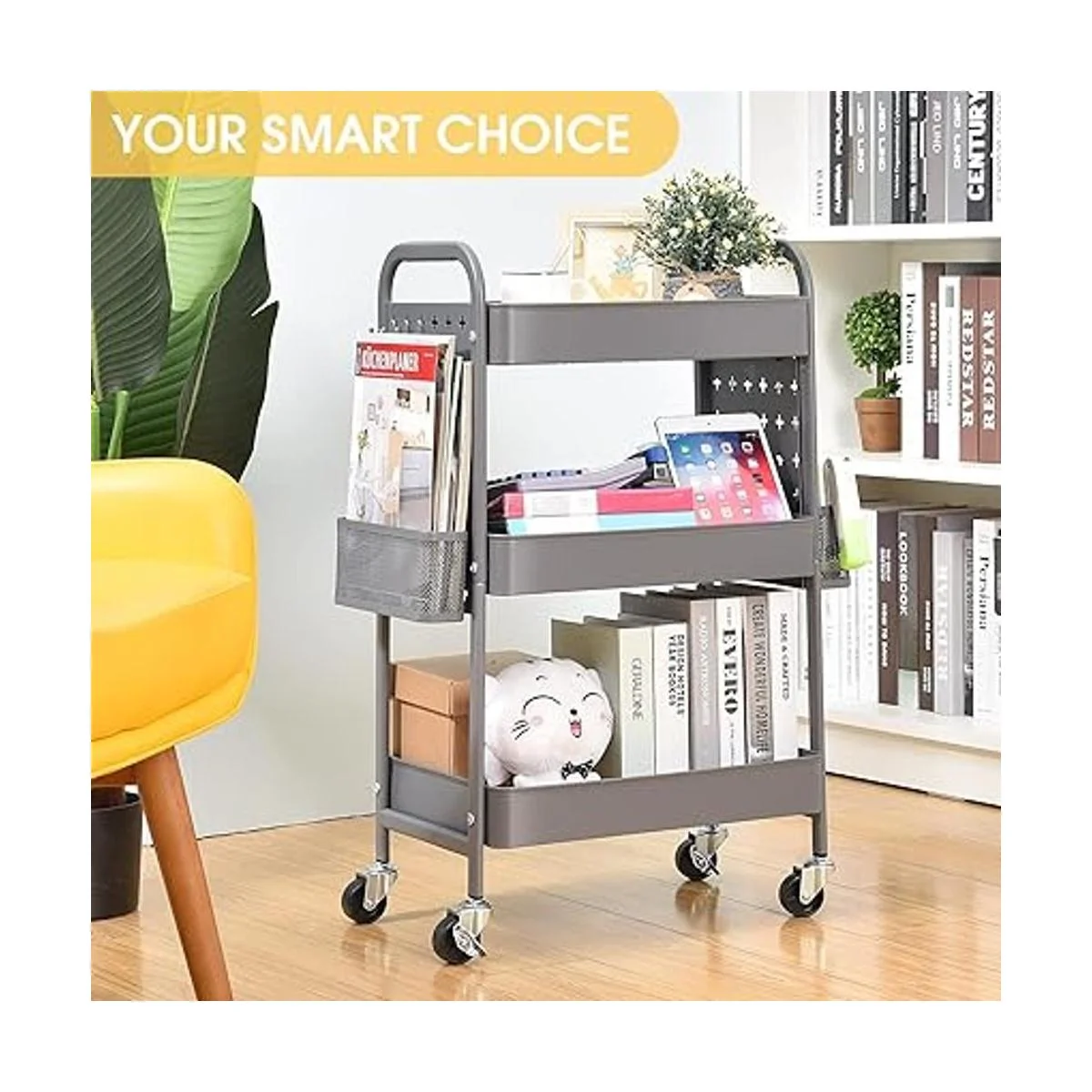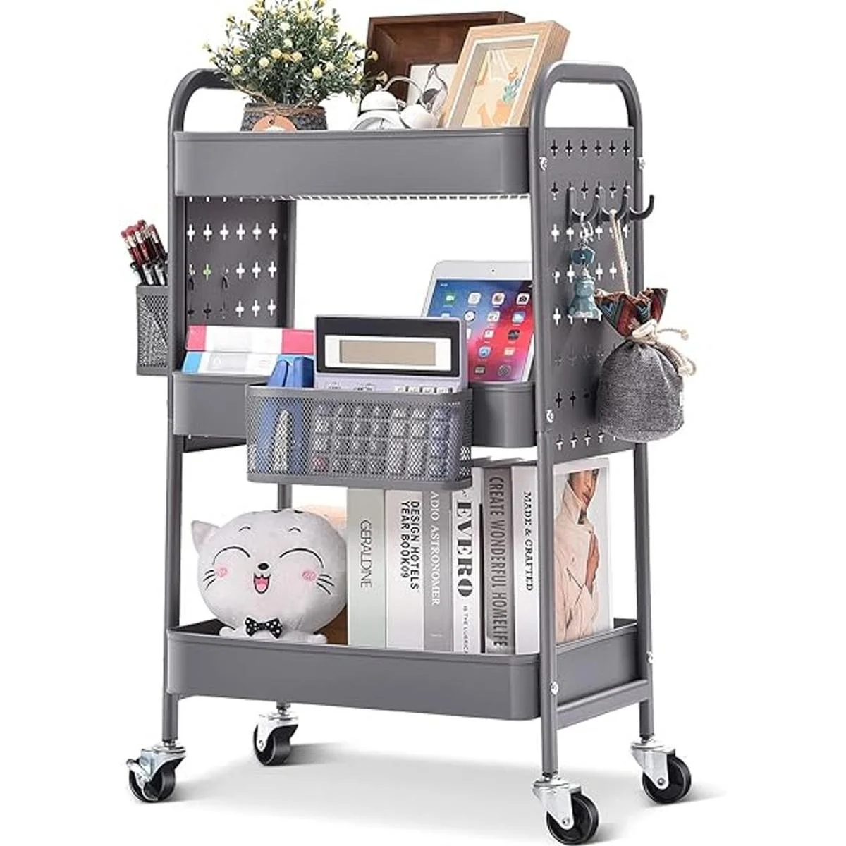 TOOLF Carrito rodante de 3 niveles, carrito de almacenamiento utilitario con tableros duales para bricolaje, carrito de manualidades con ganchos extraíbles para cestas y organizador fácil de montar para oficina, hogar, cocina, hospital, gris