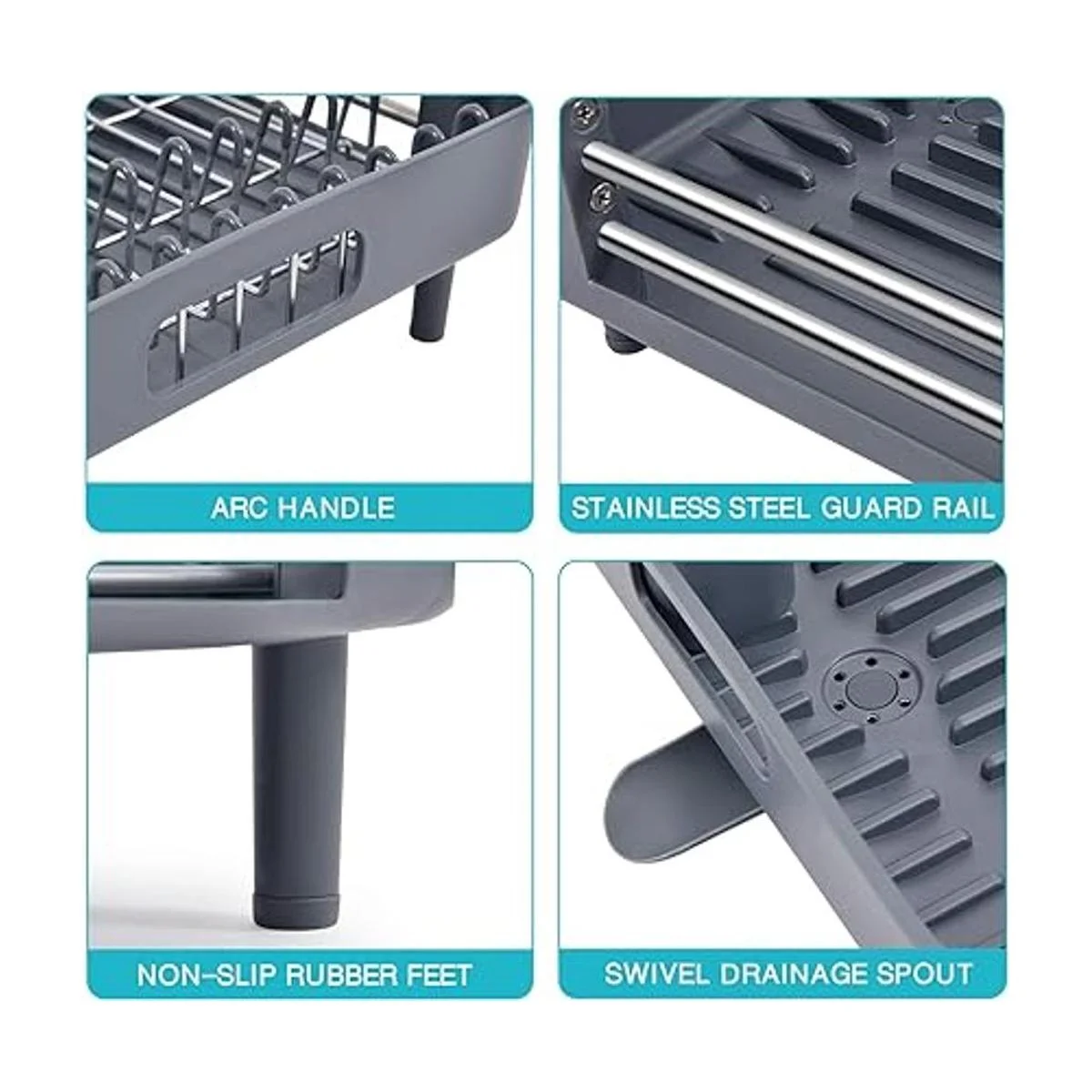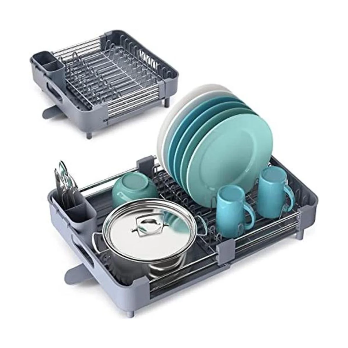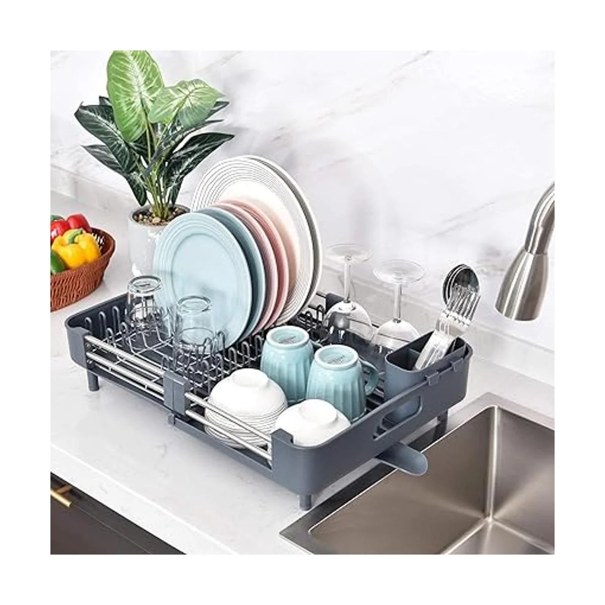 TOOLF Escurridor de platos extensible, escurridor de platos de doble parte con escurridor de cubiertos y boquilla de drenaje, escurridor de platos ajustable para cocina, 1 pieza gris