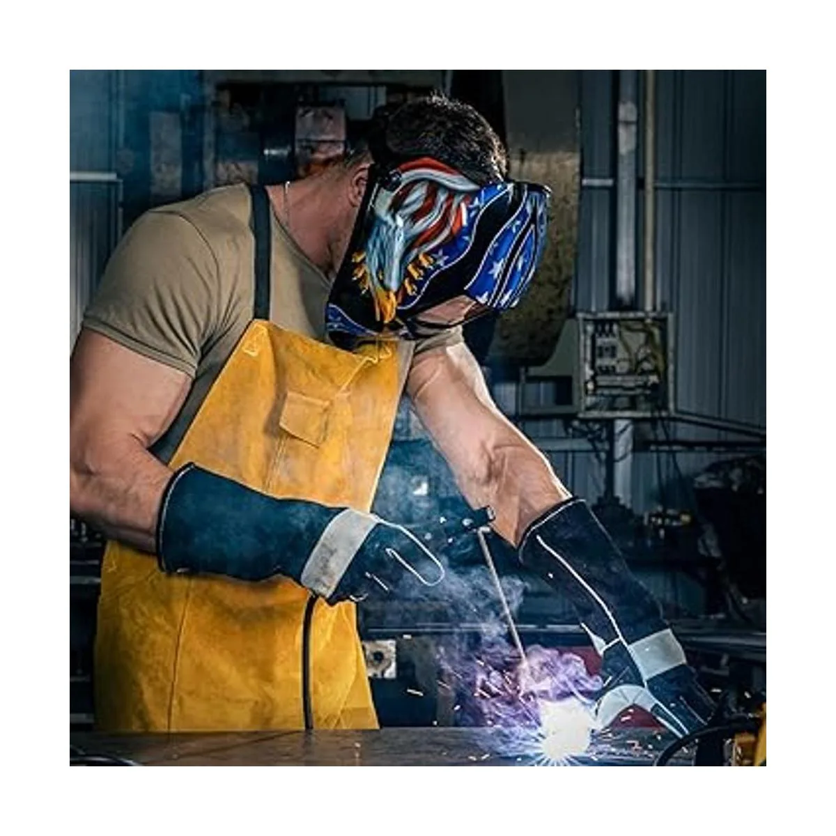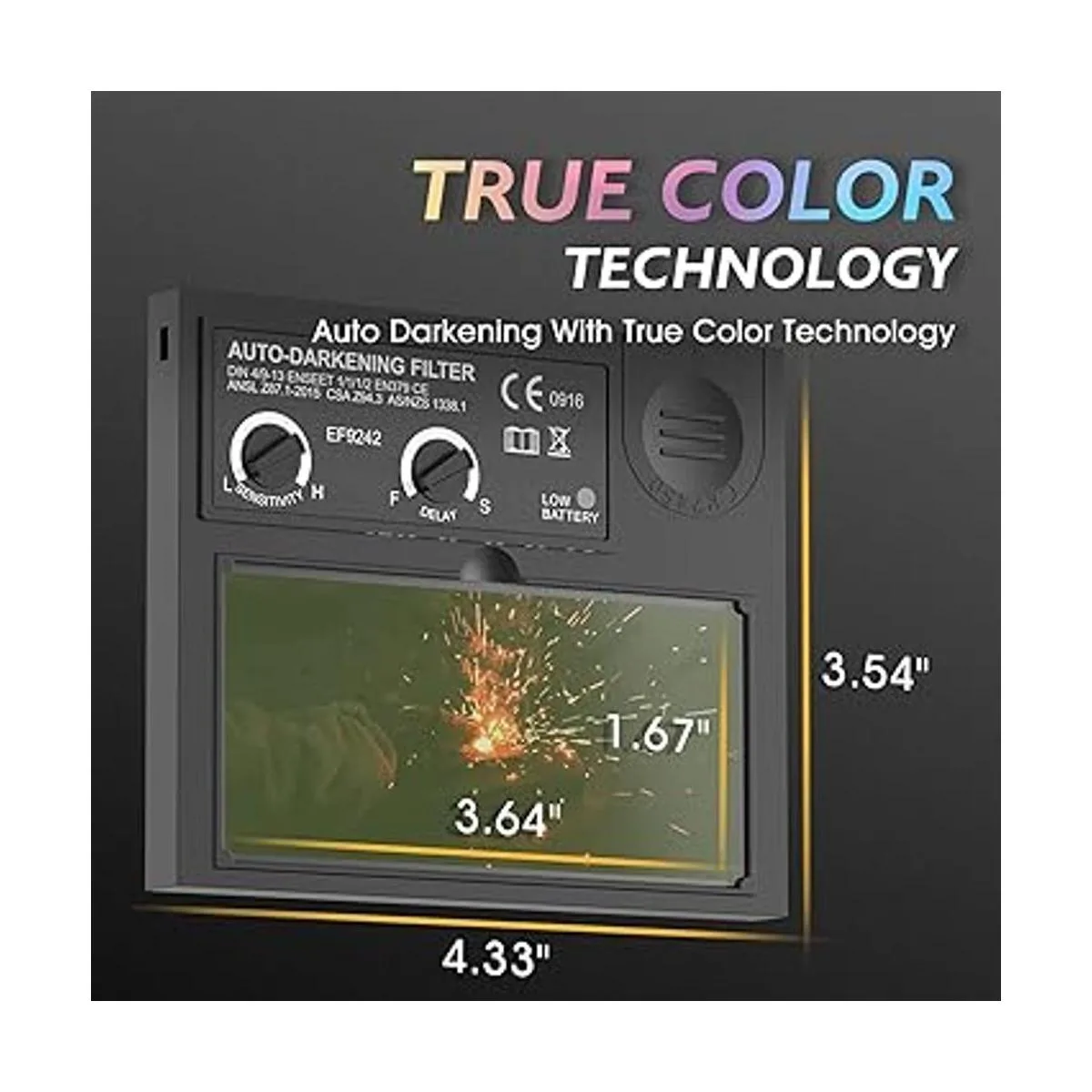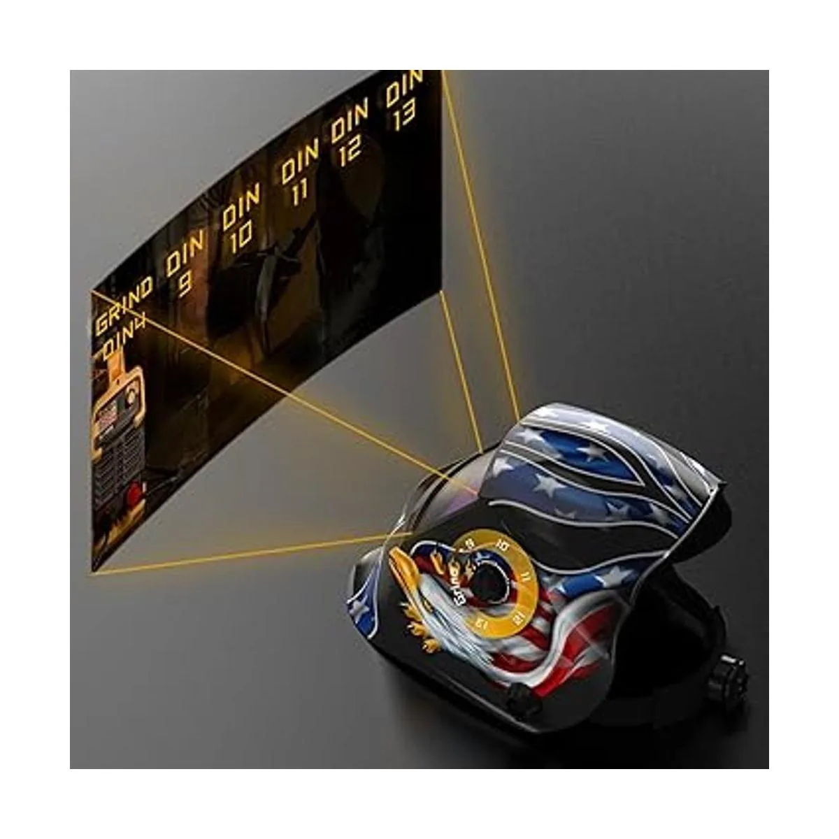 Protección: casco de soldadura equipado con filtro de oscurecimiento automático de color, cambiando de claro a oscuro en 1/30000 segundos.
