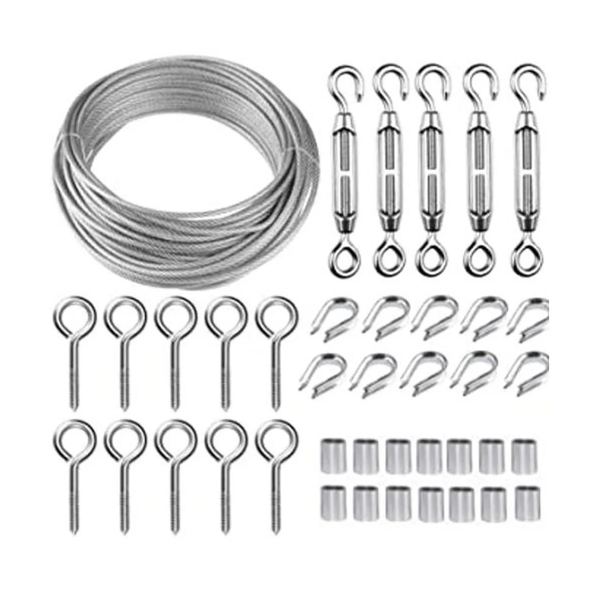 Kit de tensor y cable: viene con cuerda de alambre de metal de acero inoxidable de 100 pies/98.4 ft 1/16, 5 ganchos y ojal de tensor M5; 10 dedales de cuerda de alambre de 1/16; 10 correas de ojo de vid M5; 20 fundas de bucle de crimpado de cuerda de alambre de 1/16.