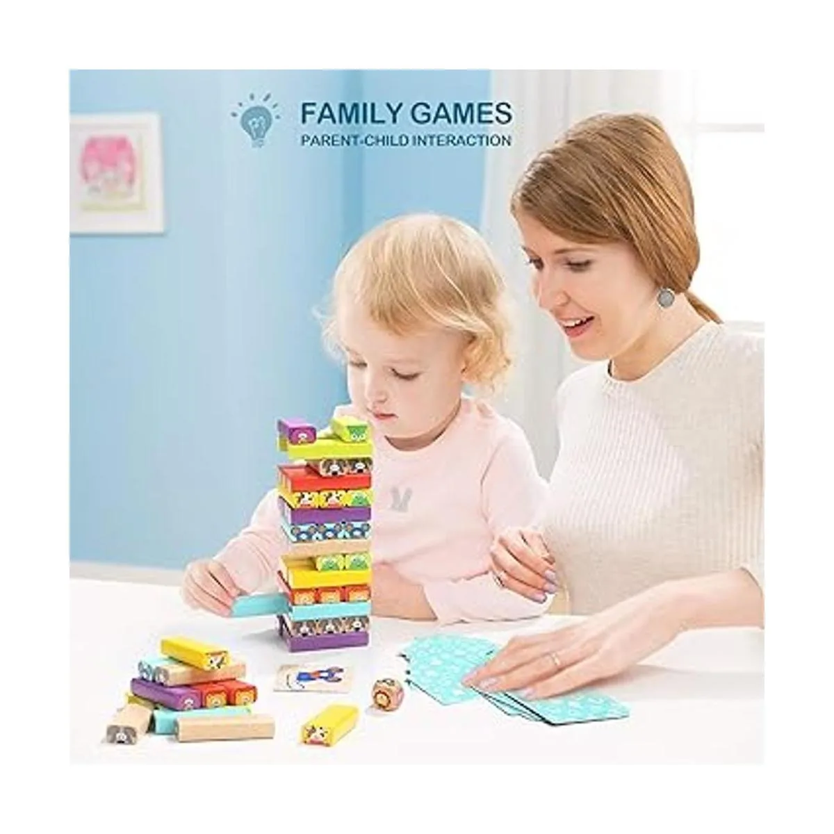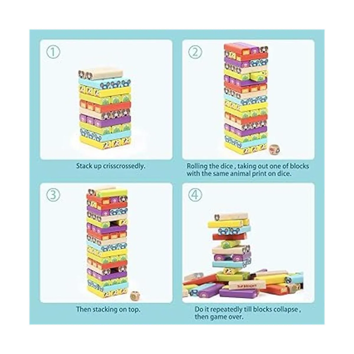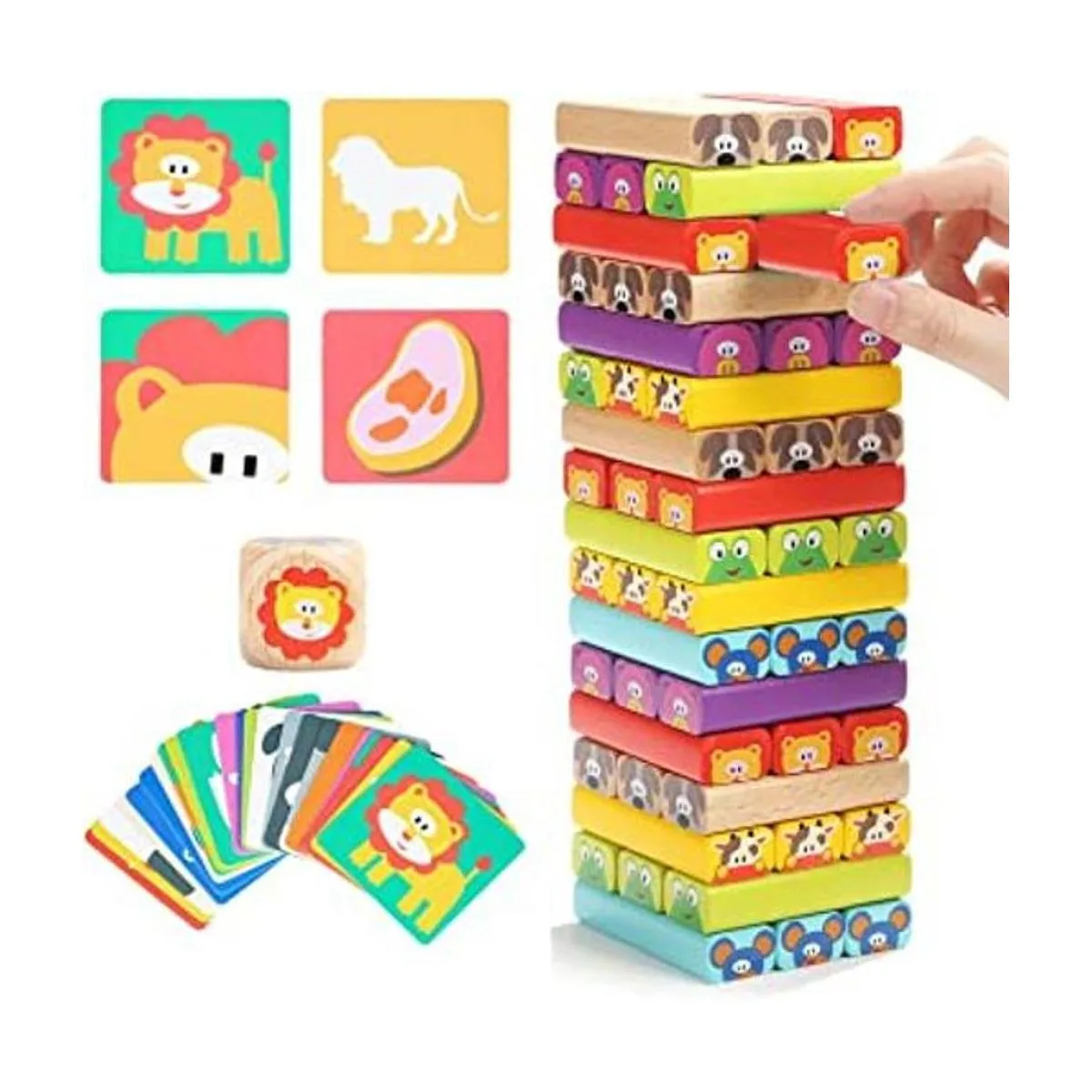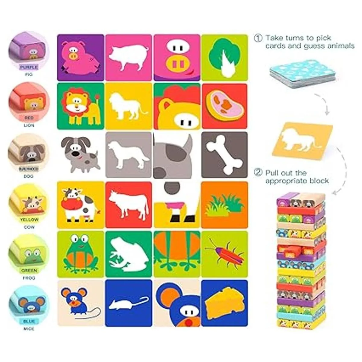51 bloques de madera para apilar: El juego de apilamiento para niños de 4 a 8 años incluye 51 bloques de animales de colores, 24 tarjetas de dibujos animados, 1 dado e instrucciones idioma español no garantizado. Una sola pieza: 2.95 X 0.59 X 0.98 pulgadas.
