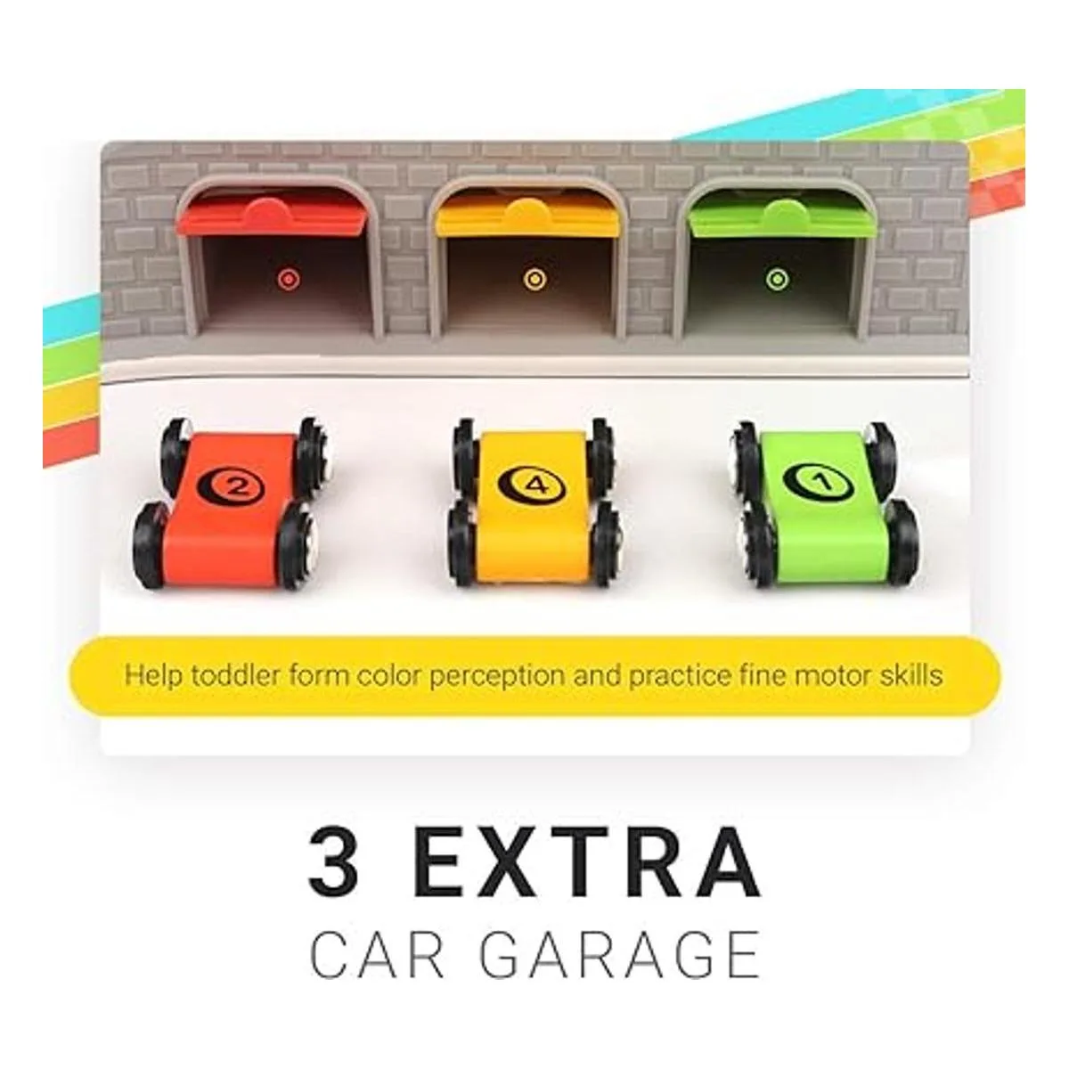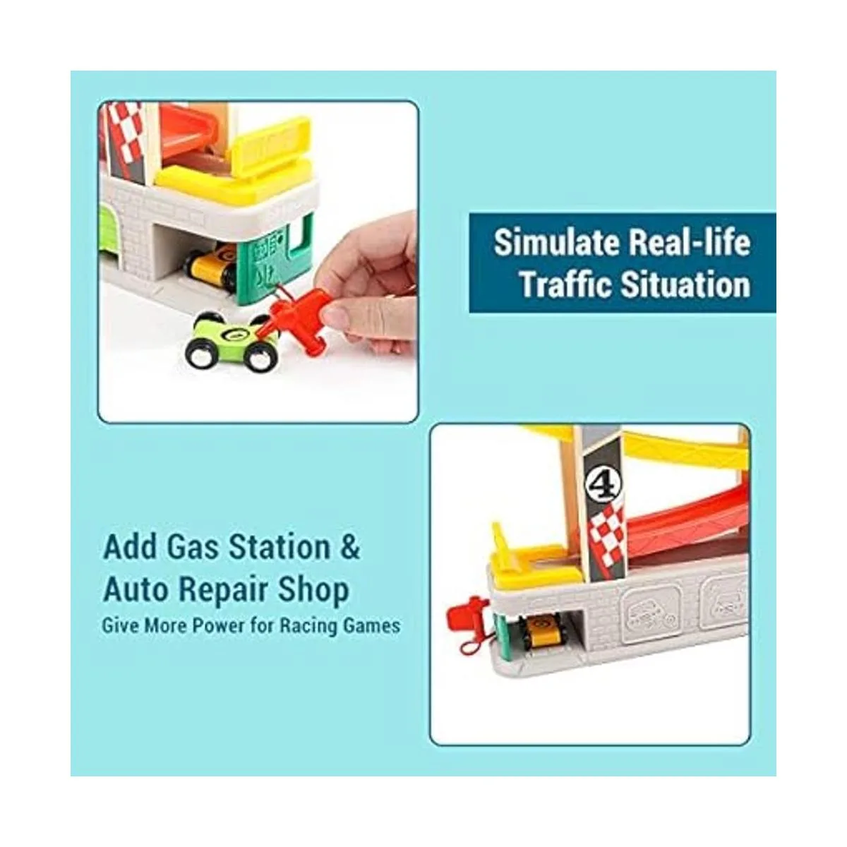TOP BRIGHT Juguetes de rampa de coche para niños pequeños de 2 a 3 años, juguete de auto de pista de carreras para niños pequeños de 2 a 4 años con 4 autos, estacionamiento y gasolinera