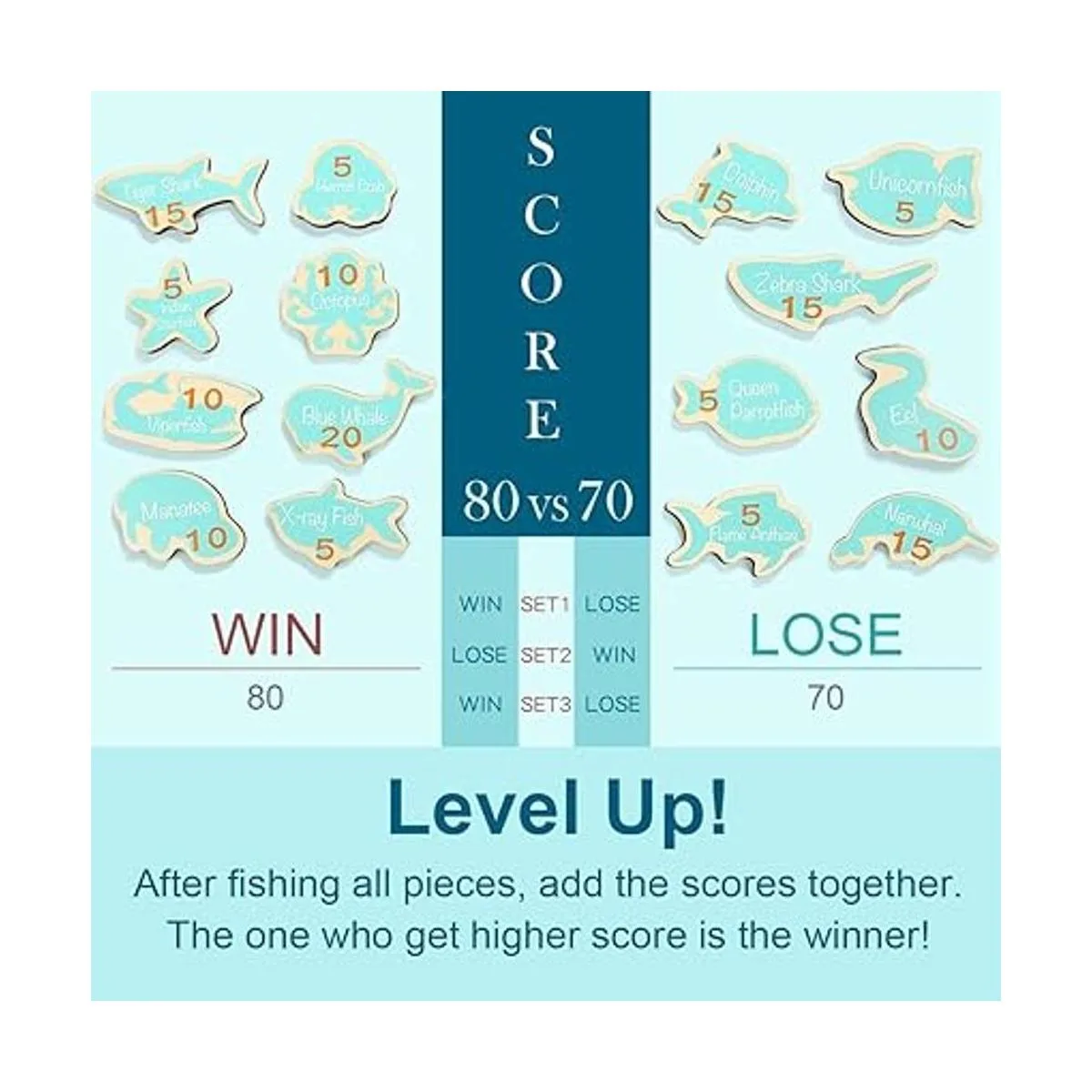 Instrucciones de juego de pesca 2 juguetes magnéticos portátiles de mano incluidos y 26 rompecabezas de peces de madera. Cada pez muestra un número diferente, después de pescar todas las piezas de bloques de juguetes de madera, añade las puntuaciones juntas y cuenta para ver quién gana. Es un juguete de educación temprana que es muy adecuado para niños y niñas de más de 36 meses