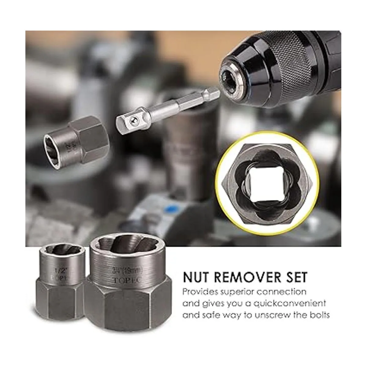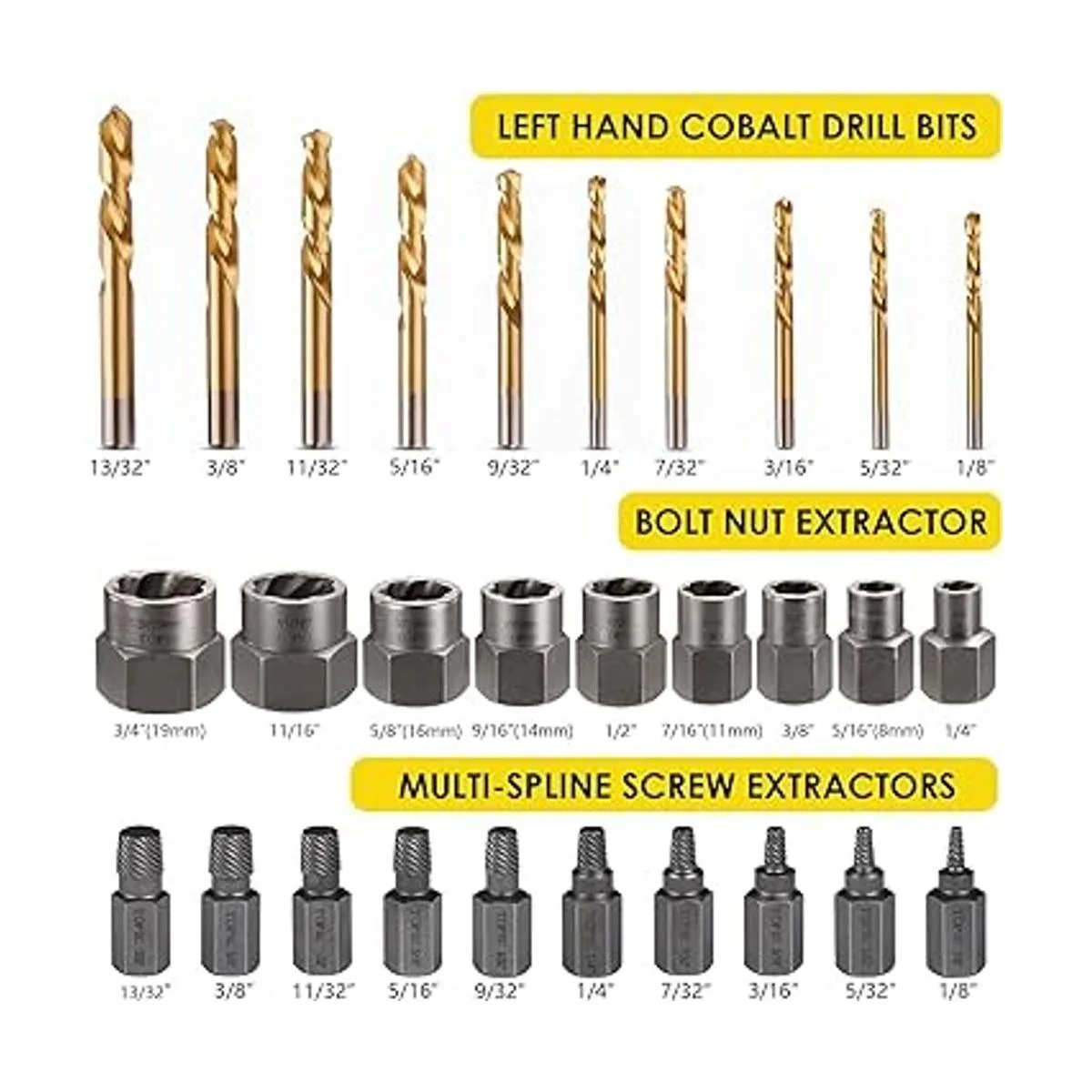 EXACT SIZE : Screw remover kit parts have clear specifications printed on them, 9pcs nut removers size: 3/4 19mm, 11/16, 5/816mm, 9/1614mm, 1/2, 7/1611mm, 3/8, 5/168mm, 1/4. 10pcs drill bit size: 13/32, 3/8, 11/32, 5/16, 9/32, 1/4, 7/32, 3/16, 5/32, 1/8. 10pcs multispline screw extractors size: 13/32, 3/8, 11/32, 5/16, 9/32, 1/4, 7/32, 3/16, 5/32, 1/8.
