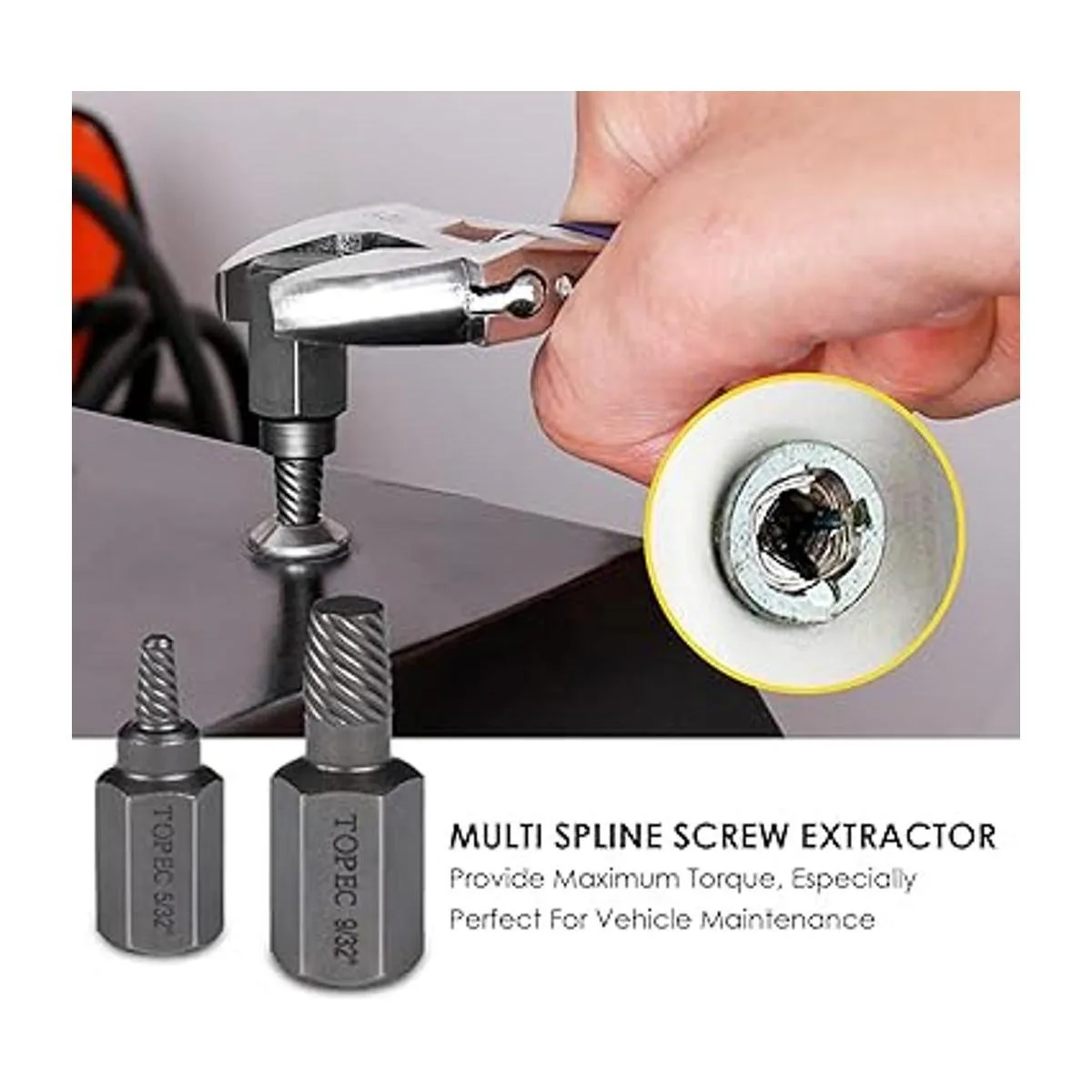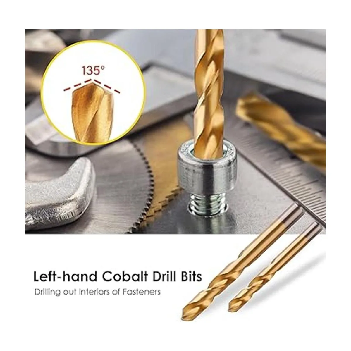 HIGH QUALITY : The nut remover/multispline screw extractor are made of high hardness chromemolybdenum steel. Reverse spiral groove design bending down to provide maximum grip force to easily remove damaged bolts, nuts, broken screws. The left hand drill is made of HHS and the head is designed with a 135 angle. which is not easily worn and has strong penetration. Surface titanium nitride coating, effective anticorrosion and rust prevention, extending service life.