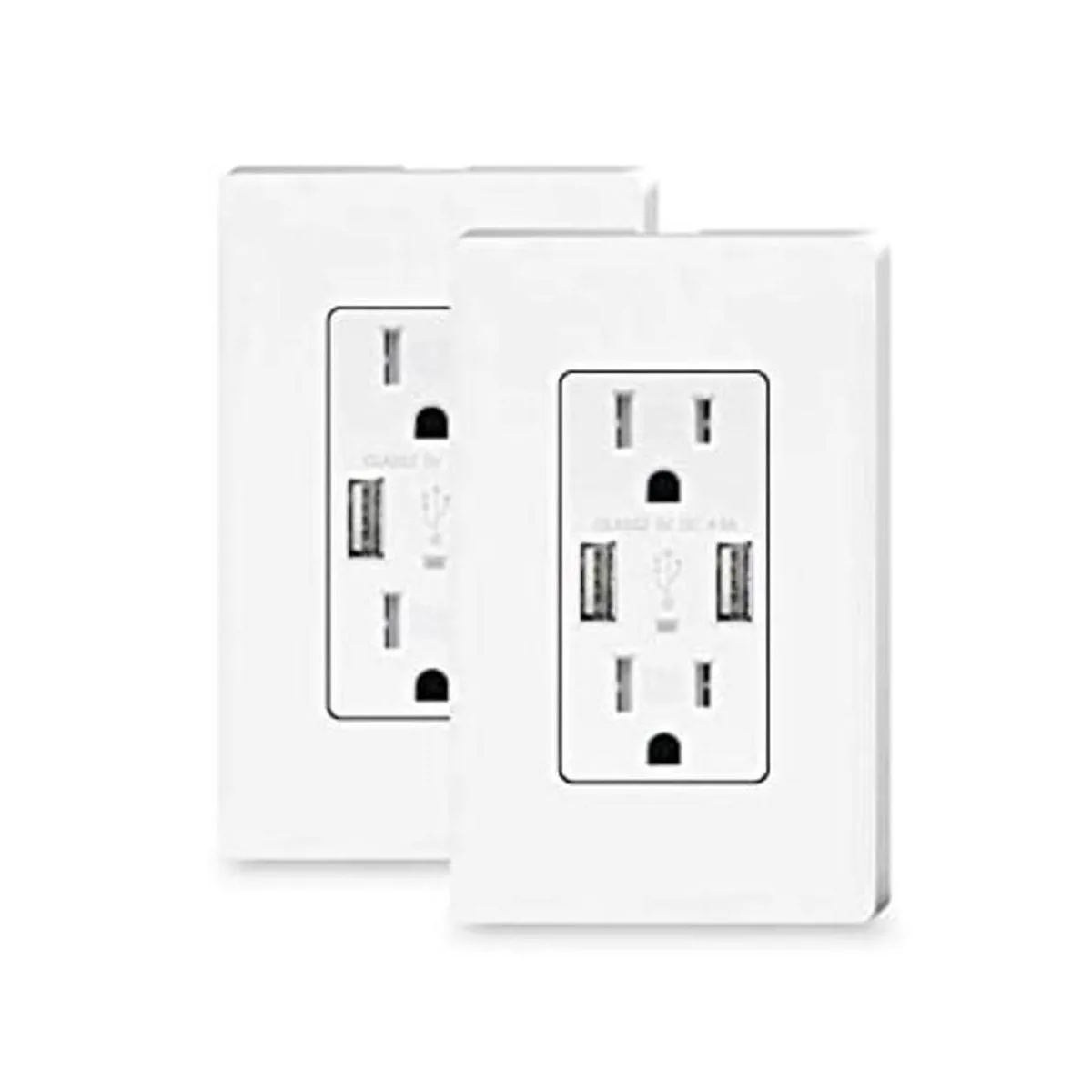 TOPELER Paquete de 2 tomas de pared USB, puertos USB de alta velocidad de 4.8 A con chip inteligente, toma de receptáculo eléctrico resistente a manipulaciones de 15 A, placa de pared sin tornillos incluida, aprobado por UL y FCC