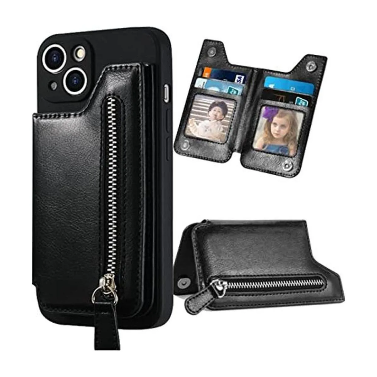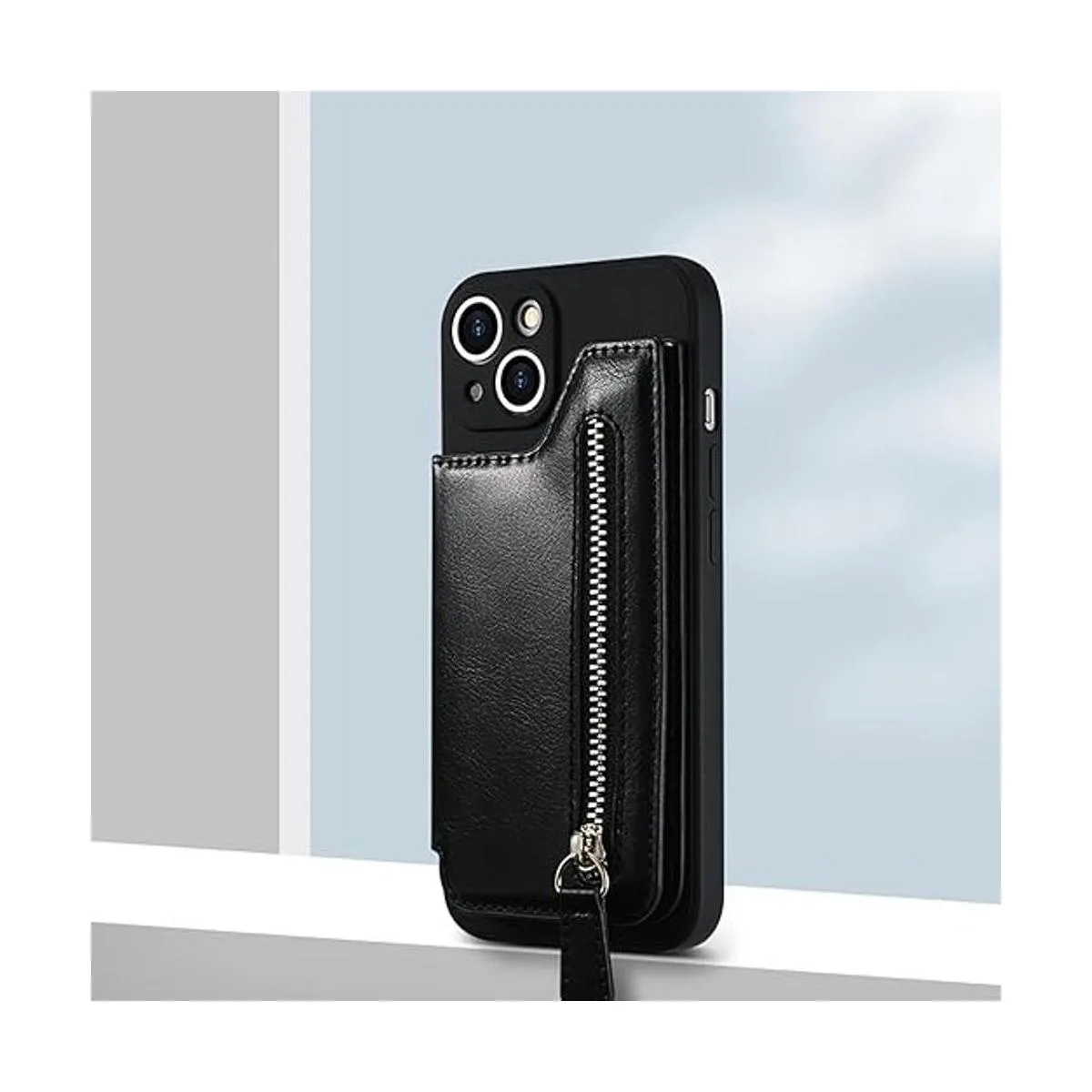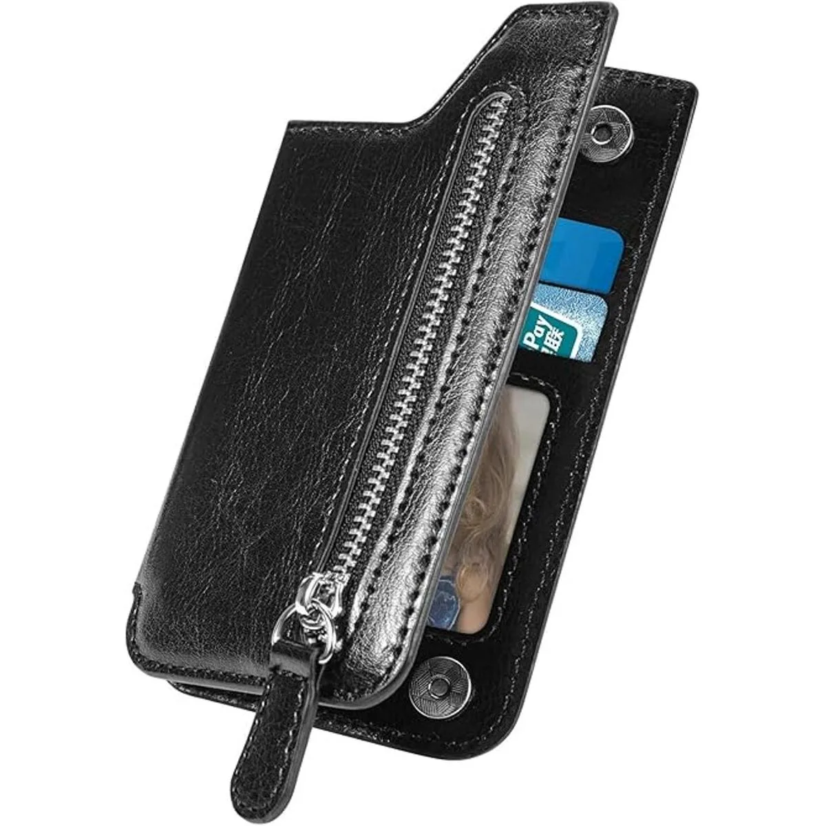TopFunny Cartera adhesiva para la funda del teléfono, tarjetero adhesivo de crédito para la parte posterior de las fundas del teléfono, funda de cuero con cremallera compatible con iPhone, Samsung Galaxy mayoría de teléfonos inteligentes, color negro