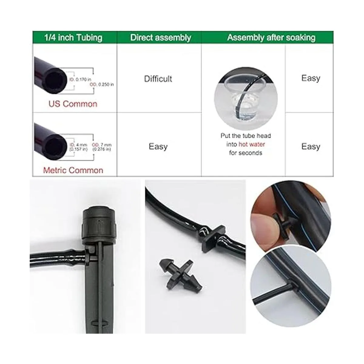Fácil de usar: 1 Conecta el emisor de goteo a un tubo de riego por goteo de 1/4 pulgadas. 2 Utiliza el acoplamiento de púas para conectar el tubo de 1/4 pulgadas a la línea principal de tubos. 3 Pegue la estaca del gotero en el suelo, ajuste el ancho de riego deseado y alimente a su planta con su propio sistema emisor de riego por goteo. Consejos: remojar la manguera en agua caliente durante unos segundos, lo que hará que el proceso de instalación sea mucho más fácil, lo que necesitas es simplemente poner una taza de agua caliente a tu lado.