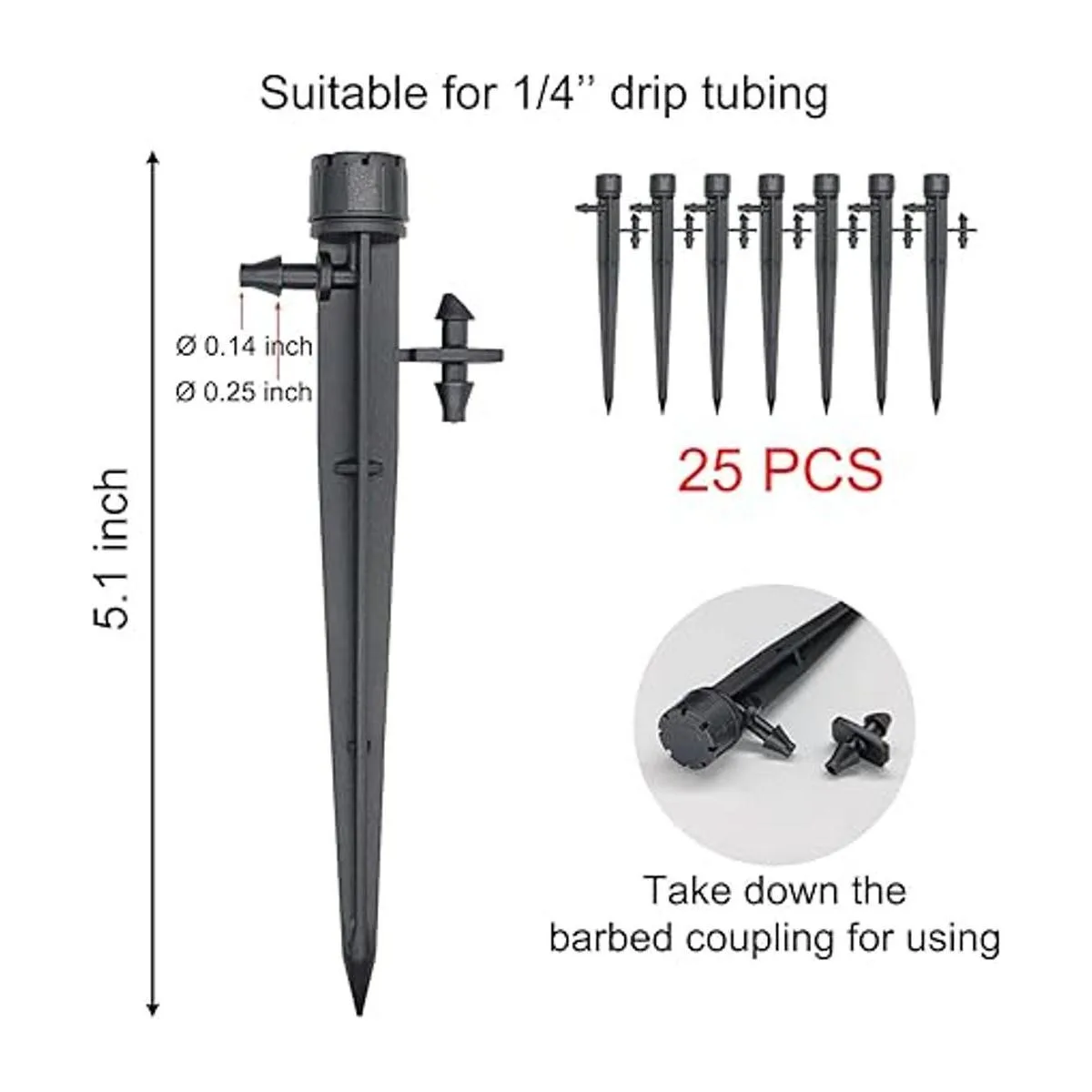 El paquete incluye: 25 emisores de goteo, 25 acoplamientos de púas en el emisor, bajarlo para usarlo, suficiente para crear un pequeño sistema de riego. El gotero mide 5.1 pulgadas de largo, se puede instalar de forma estable en el suelo directamente.